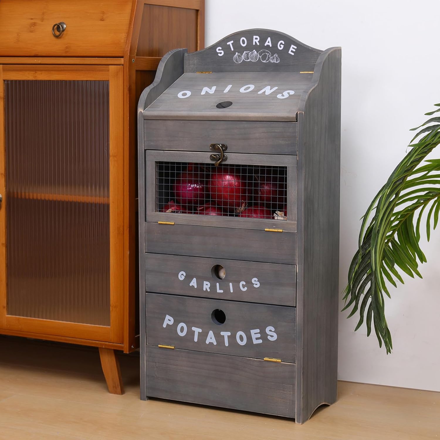 • Thoughtful Design: Expertly crafted with distinct compartments for potatoes, onions, and garlic, this bin promotes optimal air circulation and preserves vegetable quality for longer