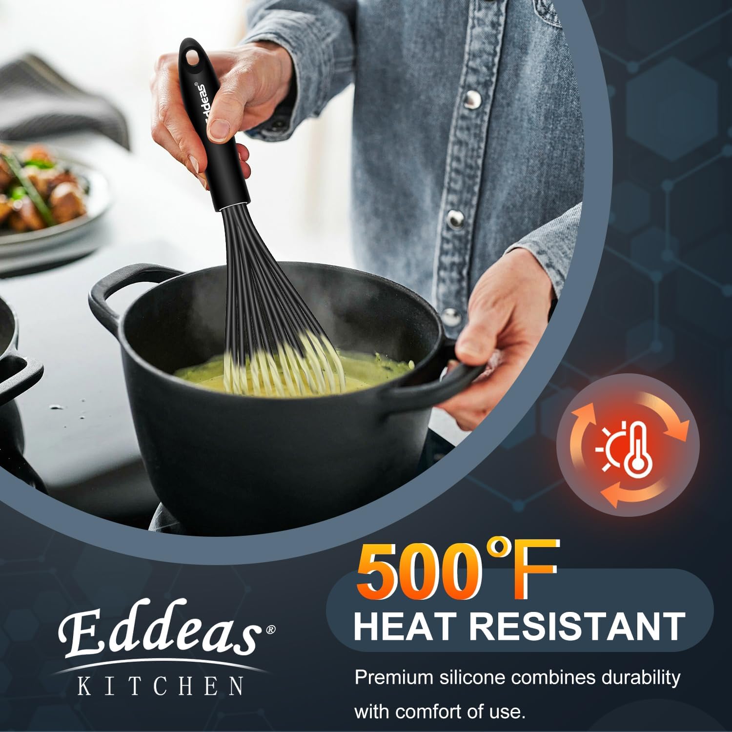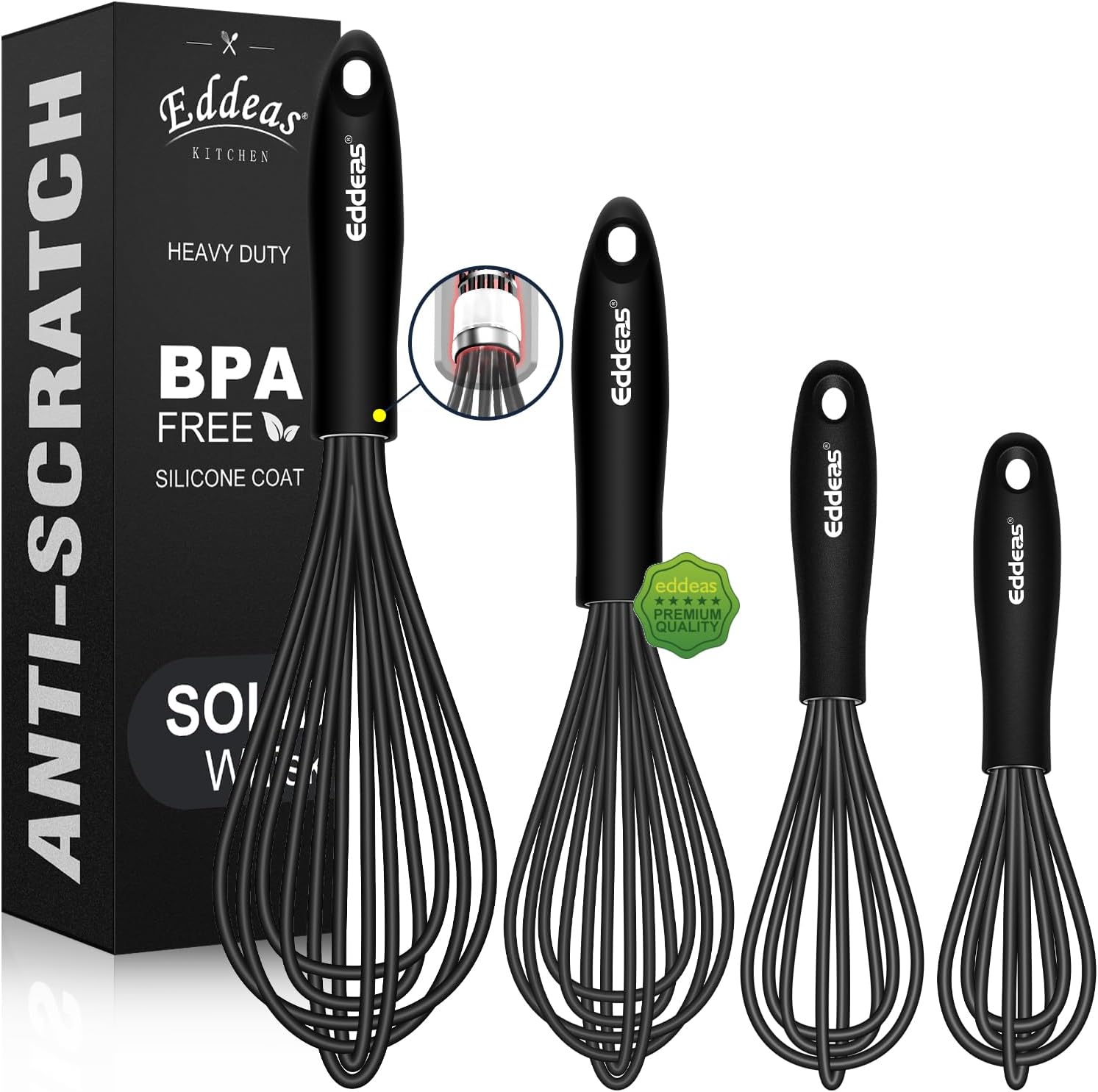 • FOOD GRADE AND BPA FREE-Eddeas Silicone whisk is made of 1.65mm stainless steel wire and 0.3mm professional non-stick silicone,food grade material,BPA free,Won't scratch the surface for your pots and pans.