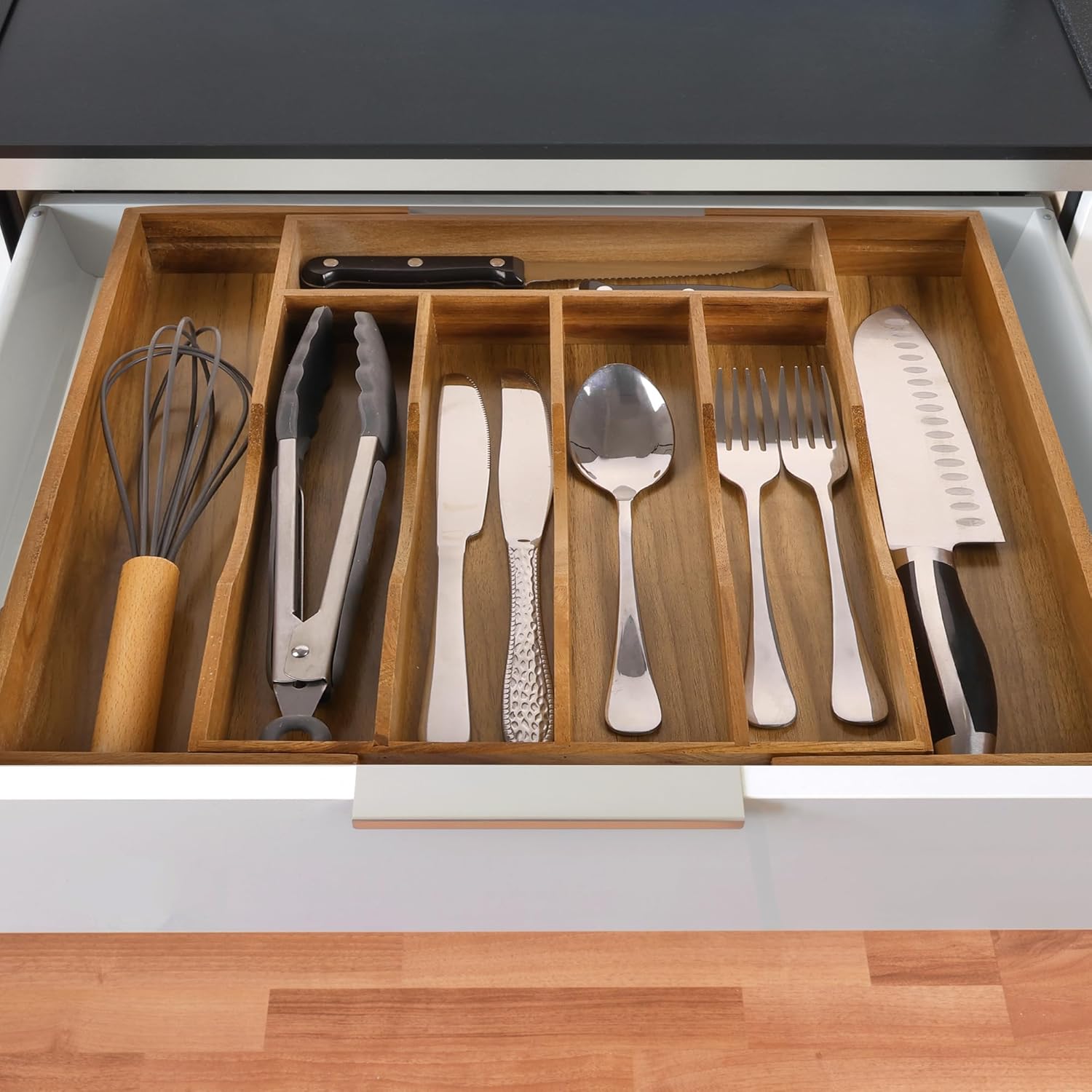 • [START YOUR KITCHEN ORGANIZATION]: The 10.04" - 15.5" wide, 13.98" long and 1.97" deep acacia drawer organizer can tame your out-of-control kitchen drawers, to store and organize the cutlery and kitchen utensils according to your rules, and maximize the drawer storage. Keep everything accessible and organized, so that you don't have to rifle around for your cooking tools. Beautiful and practical kitchen drawer organizer turns the cooking and tasting into things of beauty and efficiency.