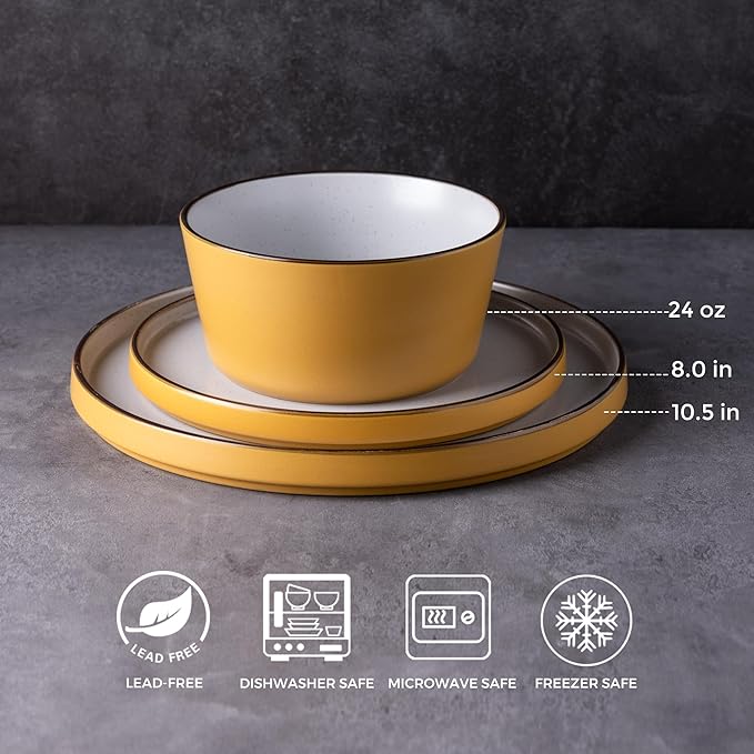 • ELEGANT AND MODERN:Our dinnerware set are designed with two different glazes,the surface develops a white-grey color withe Speckled,and the egde and button cover with another beautifull color. This plates and bowls sets will make your table look more elegant and modern,making your food look even more delicious and happy every day for you,Perfect for housewarming, Thanksgiving, Christmas, and other fun celebrations.We are sure the items will Impress your guests by its unique and charming relief design.