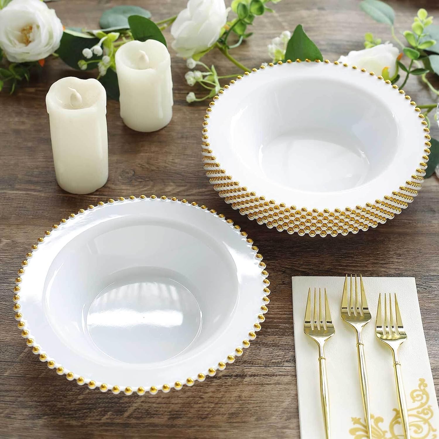 • White with Gold Beaded Detailing: Bring elegance to your event with these 12oz white plastic bowls, beautifully finished with a gold beaded rim, suitable for weddings, showers, or banquets seeking premium disposable tableware and modern flair.
