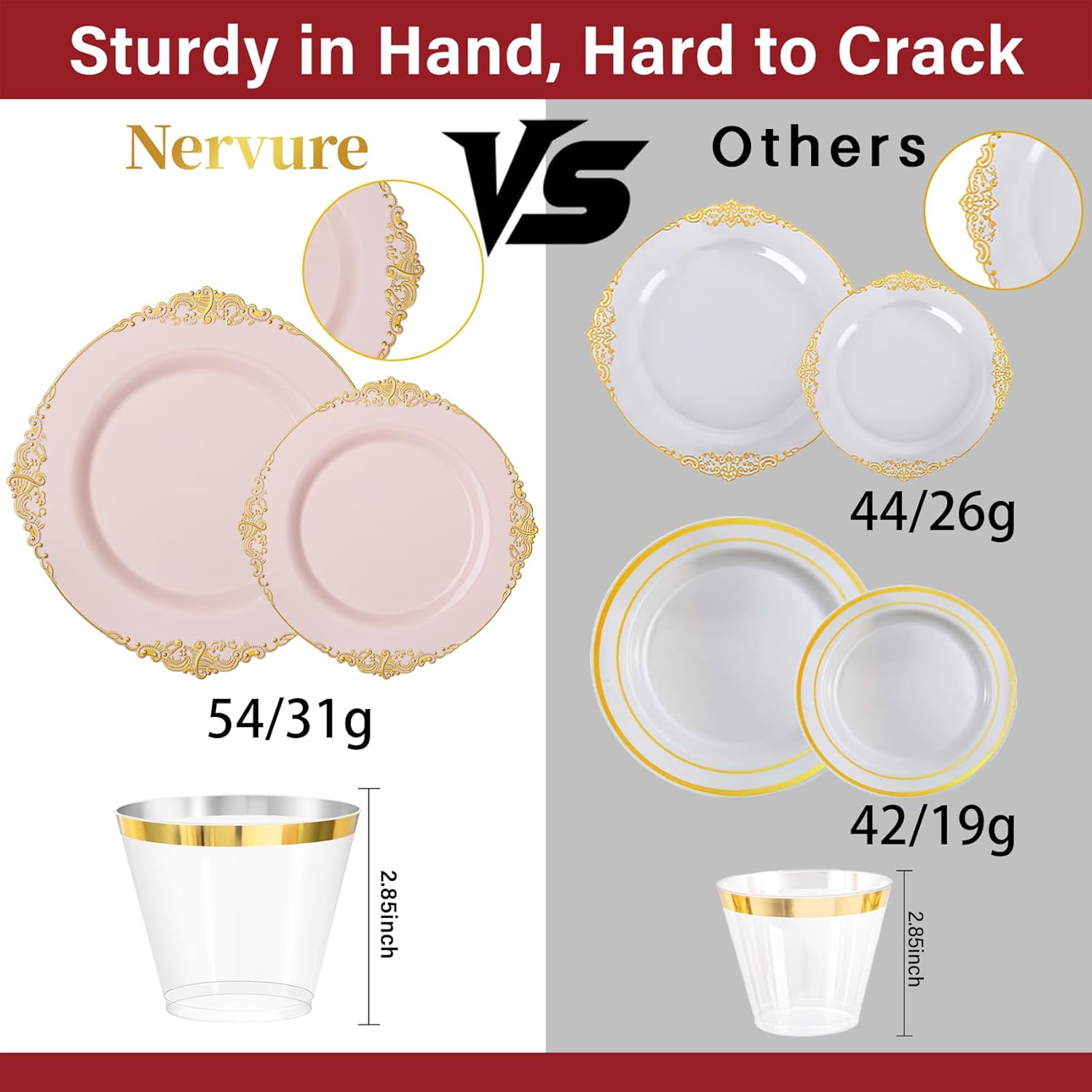 • 25 Guest Set: You can get 25 10.25inch pink dinner plates, 25 7.5inch pink dessert plates, 25 9oz gold rim plastic cups and 25 pre rolled napkins with gold plastic silverware sets