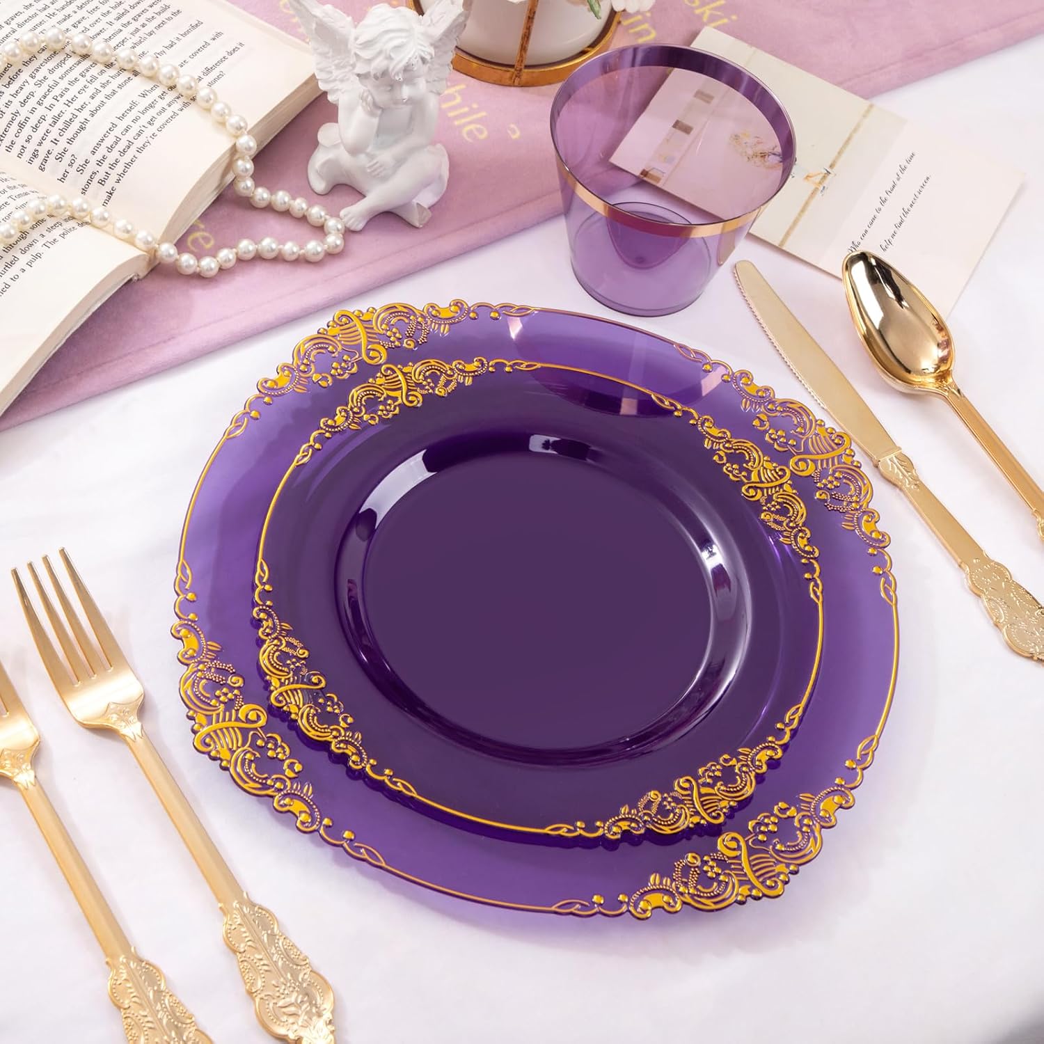 • 25 Guest Set: The clear plastic plates include 25 dinner plates, 25 salad plates, 25 knives, 25 forks, 25 spoons, 25 cups, 25 napkins. Purple disposable plates are packed in a solid gift box. The set of gold party plates will allow you to entertain 25 guests.
