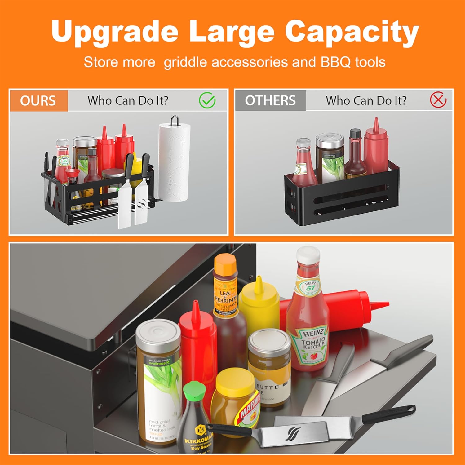• 【Large Size Design】Our griddle caddy' Size(L:13.3” x W:5.8” x H:4.8”)is larger than similar styles on the market, which can hold more grilling tools(grill utensils, oil bottles, sauces, seasonings, scrapers, spatulas), free up your counter space to place more food and make your countertop more tidy and clean. Fits a wide range of grills and griddles with side table.