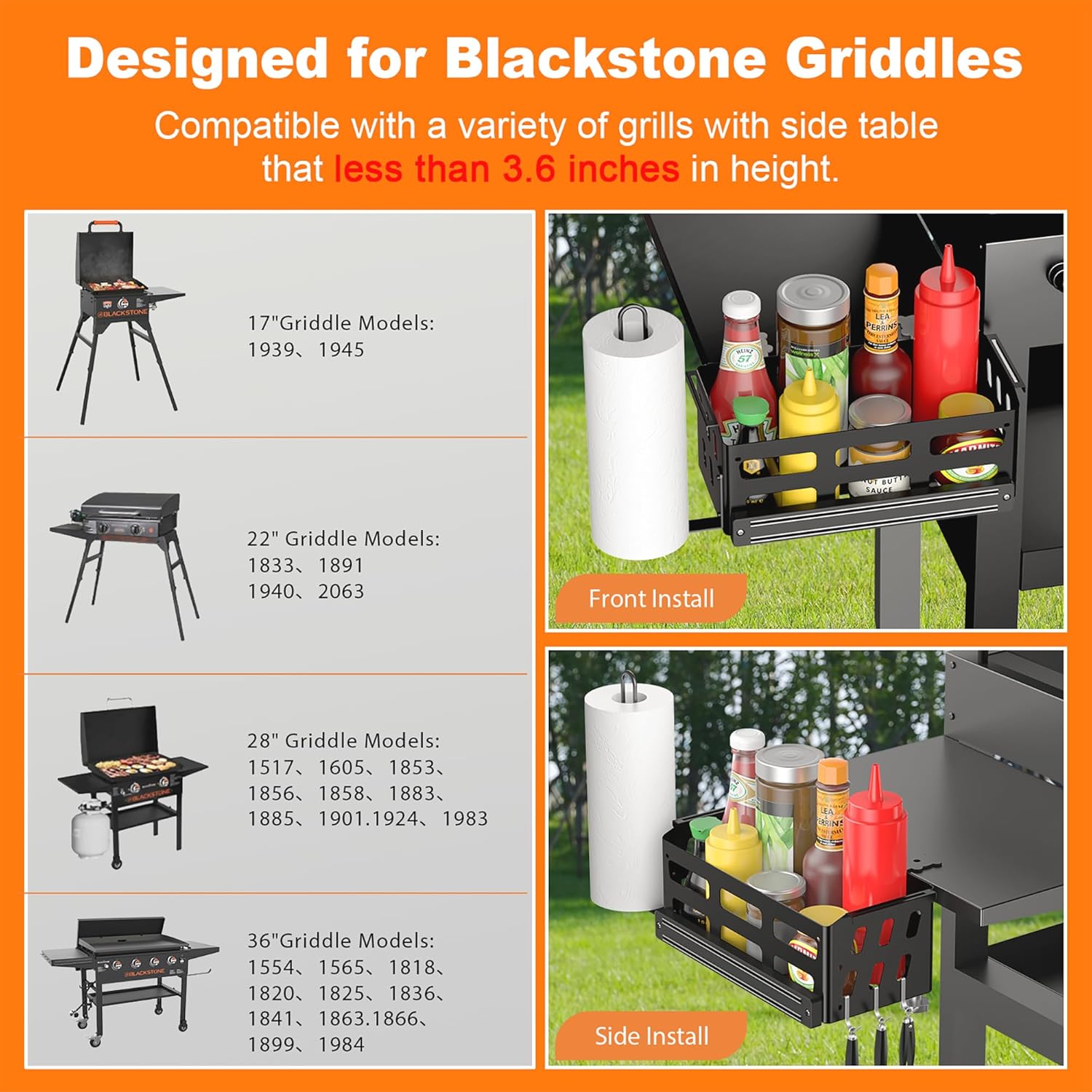 • 【Easy to Install & Removable】The Blackstone griddle caddy comes with an installation manual. You can install the griddle caddy on the blackstone grill in some simple steps with a tool-free no drill. Not only for 17"/22"/28"/36" Blackstone griddles, the unique mount design matches countertops up to 3.6" thick.