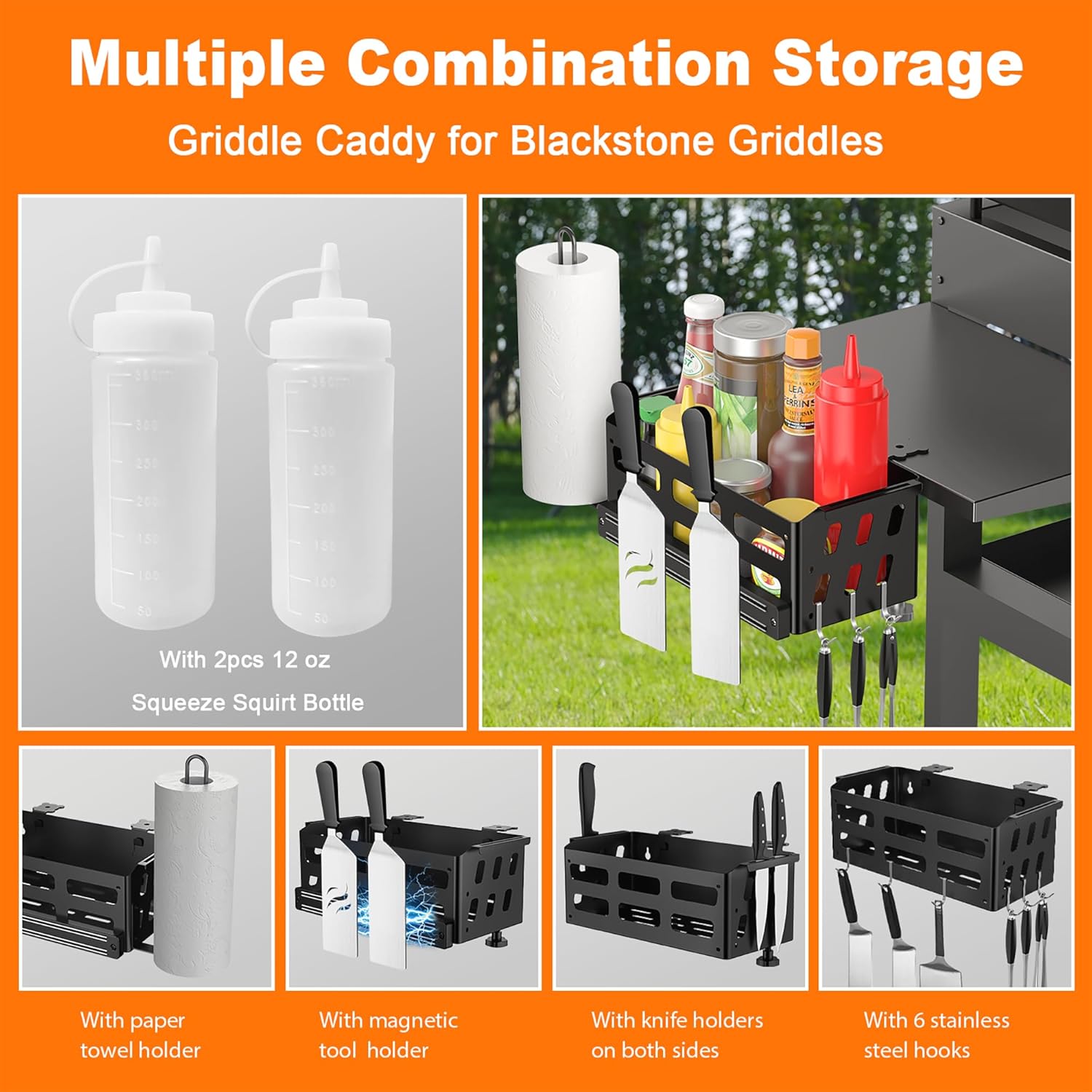 Griddle Caddy for Blackstone Griddles 28"/36"/Prep Cart, Blackstone Caddy with Squeeze Bottle, Blackstone Griddle Accessories Space Saver, BBQ Grill Storage Organizer with Magnetic Tool Holder