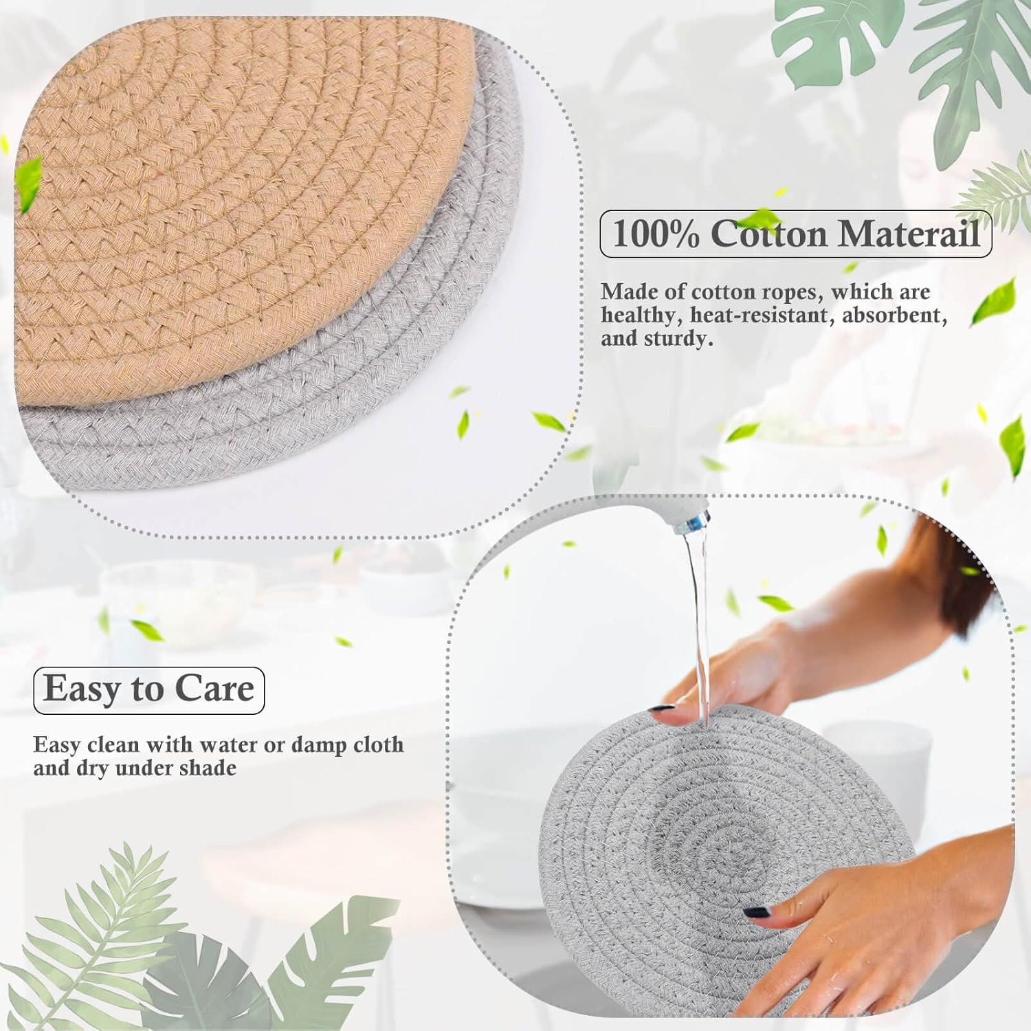 • Excellent Water Absorption - These Hot Pads is made of cotton ropes, which are super absorbent and sturdy. No worry about dishes or pans will dirty your table. Pure cotton material supports hand wash and machine wash.