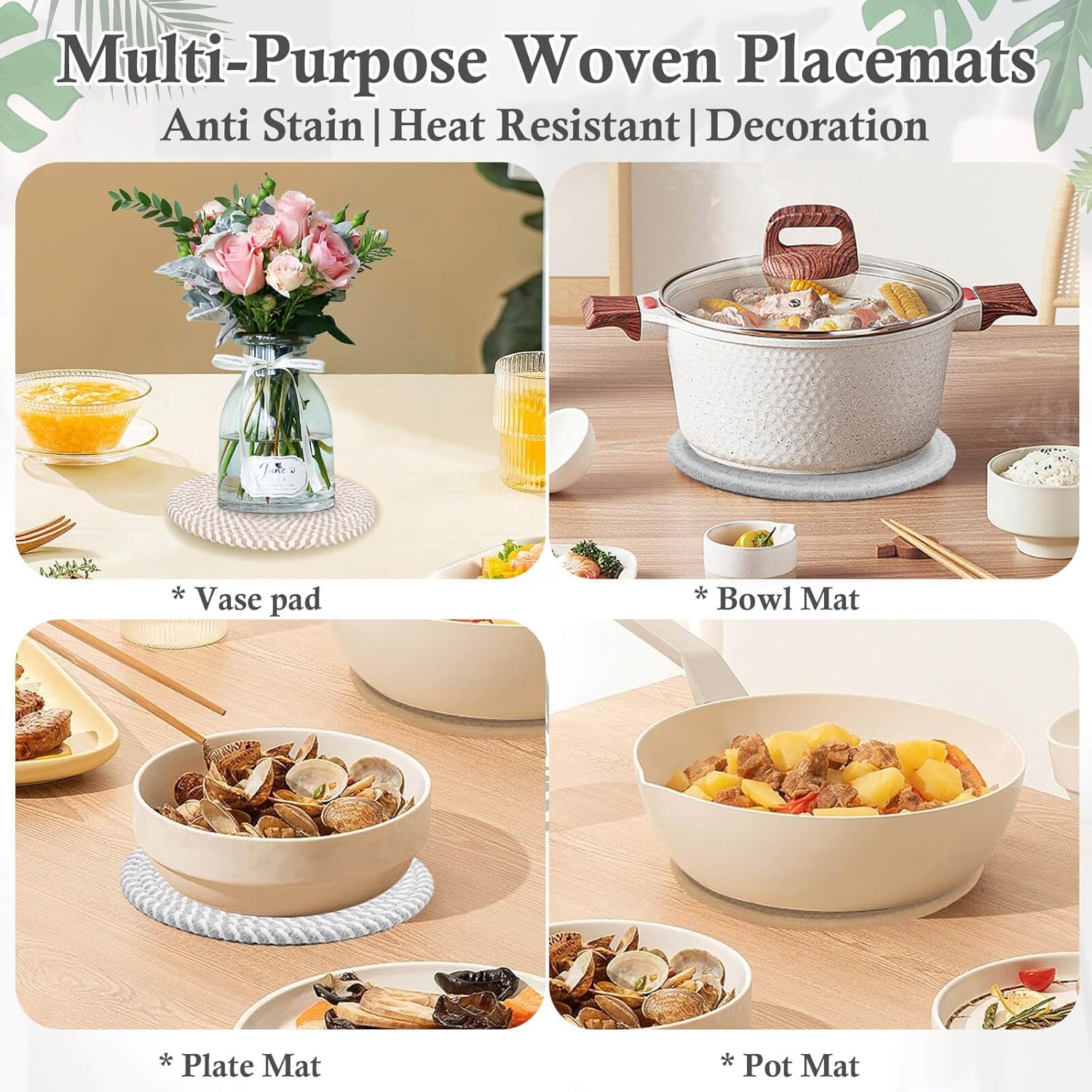 • Heat Resistant - Our pot holders are thickened to withstand temperatures up to 356°F. They can be placed under hot dishes, hot pots and pans as protection and decoration, which can effectively blocks heat sources, scratches and stains, perfectly protecting the tabletop and extending the life of the table.