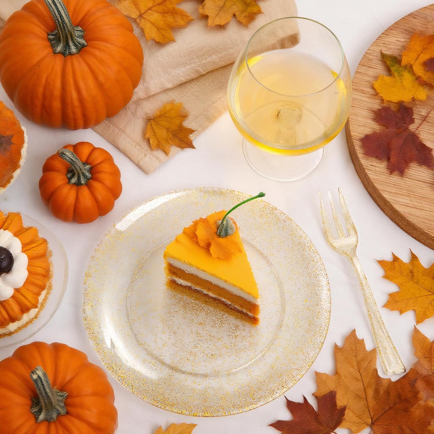 • BRILLIANT GOLD GLITTER: This 6.3" gold glitter plastic dessert plates and 5" plastic forks set with 100 pcs comes with a charming gold glitter effect, add a sparkling glamour to your appetizers, cakes, salads, cookies and desserts, these plastic dessert plates make the dining experience more wonderful.