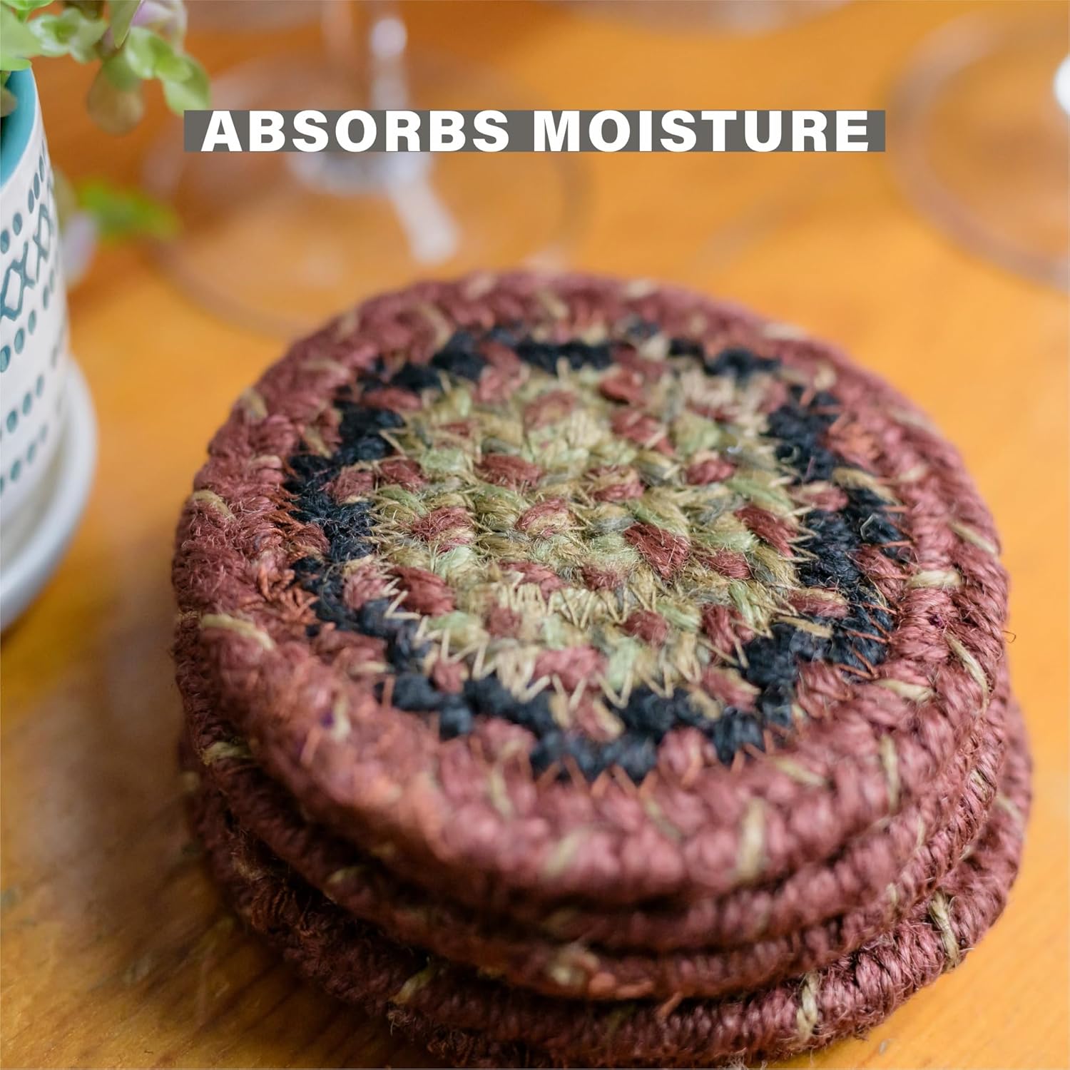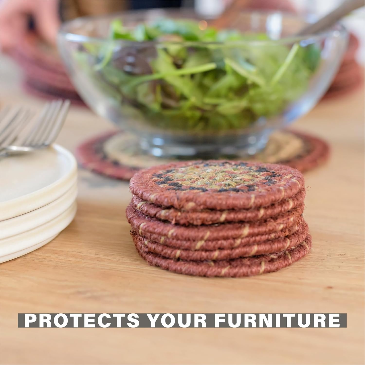 • Highland JUTE BRAIDED TRIVET: Simple Scottish-inspired beauty comes in the form of our Highland Jute collection. With pleasing barn red, charcoal, and sage green, this rug is perfect for any rustic space from dining room to home office and anywhere in between. Protect your furniture and add a tasteful accent to your dinner table, bedside table or living room furniture. The 8" diameter round Jute trivet is an ideal size for small serving dishes or a vase.