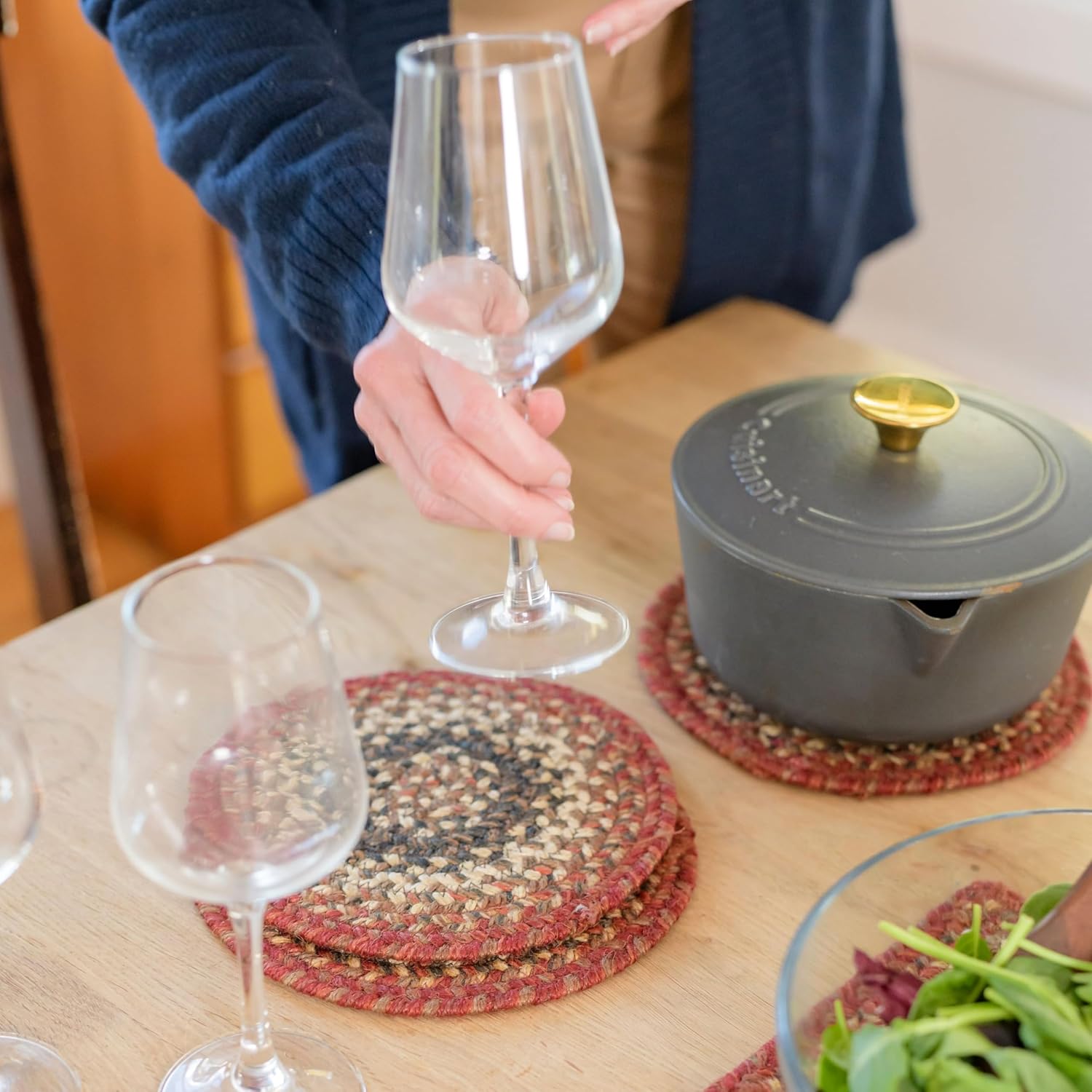 • Chester JUTE BRAIDED TRIVET: Rustic barn red, charcoal, warm brown, and cream make Chester the perfect accent for traditional American decor. committed to producing high-quality, handcrafted, unique products, and providing excellent customer service. Protect your furniture and add a tasteful accent to your dinner table, bedside table or living room furniture. The 8" diameter round Jute trivet is an ideal size for small serving dishes or a vase.