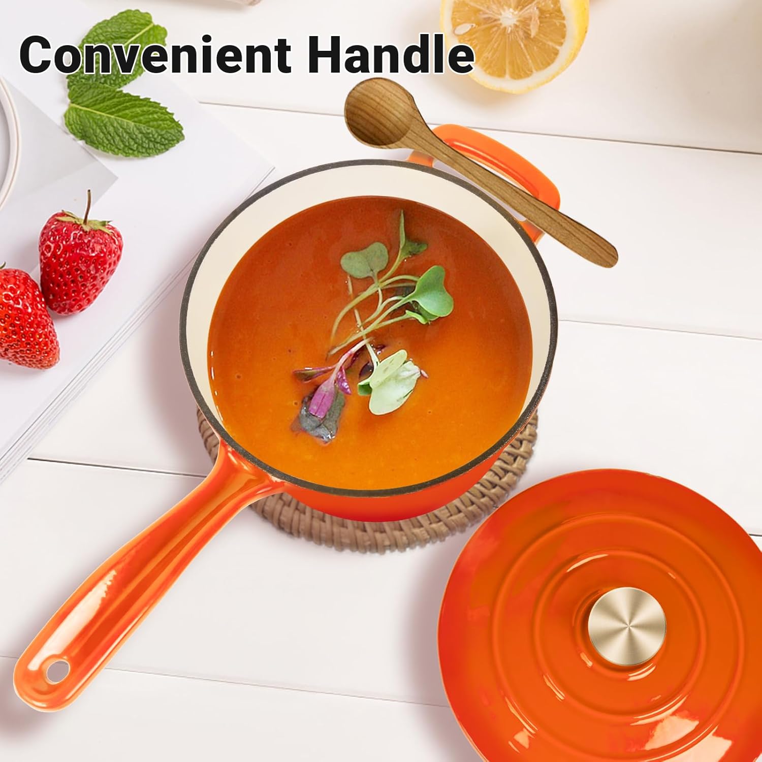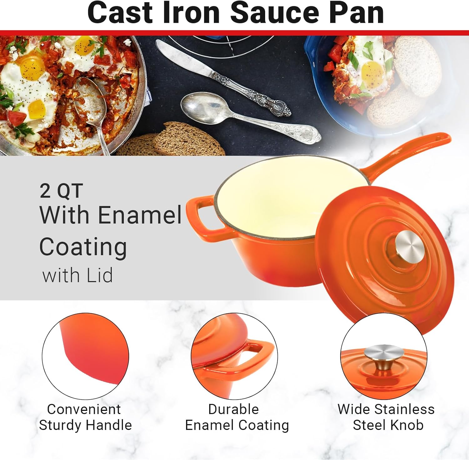 • 【High Quality Enameled Coating】-2 QT sauce pan with lid is made of premium cast iron with a high-quality triple enameled coating on the interior and exterior. With superior durability, our sauce pan resists rusting, scratches, cuts and cracking. It can withstand daily use and last for years. Great for preparing and serving memorable meals