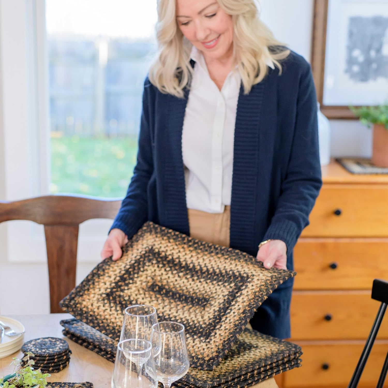 • PRIMITIVE PLACEMATS WITH SUPERIOR CRAFTSMANSHIP: Our primitive placemats are crafted with no ends or gaps. The edges are straight and smooth, ensuring the placemat lays flat on your table. The quality of our jute yarn is evident in the strength and durability of the placemat. Like a good quality wool sweater, our placemats won’t pill or shed, thanks to the use of long fiber jute yarn.