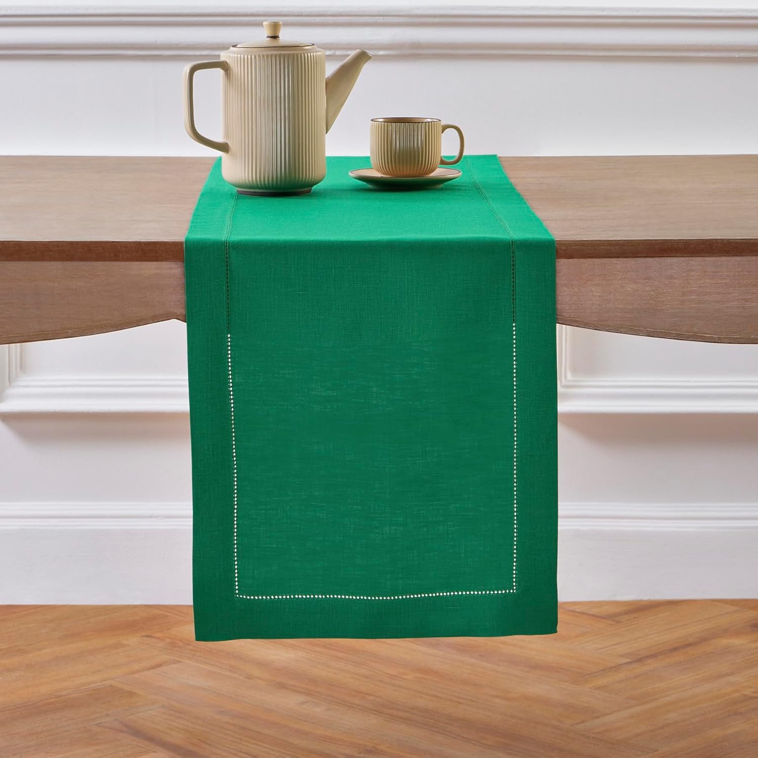 • 𝗖𝗼𝗺𝗽𝗼𝘀𝗶𝘁𝗶𝗼𝗻 𝗮𝗻𝗱 𝗖𝗿𝗮𝗳𝘁𝘀𝗺𝗮𝗻𝘀𝗵𝗶𝗽 : 100% Pure European Flax Linen Emerald Green Thanksgiving Table Runner - 𝗖𝗹𝗮𝘀𝘀𝗶𝗰 𝗛𝗲𝗺𝘀𝘁𝗶𝘁𝗰𝗵 | Handcrafted By Skilled Artisans.