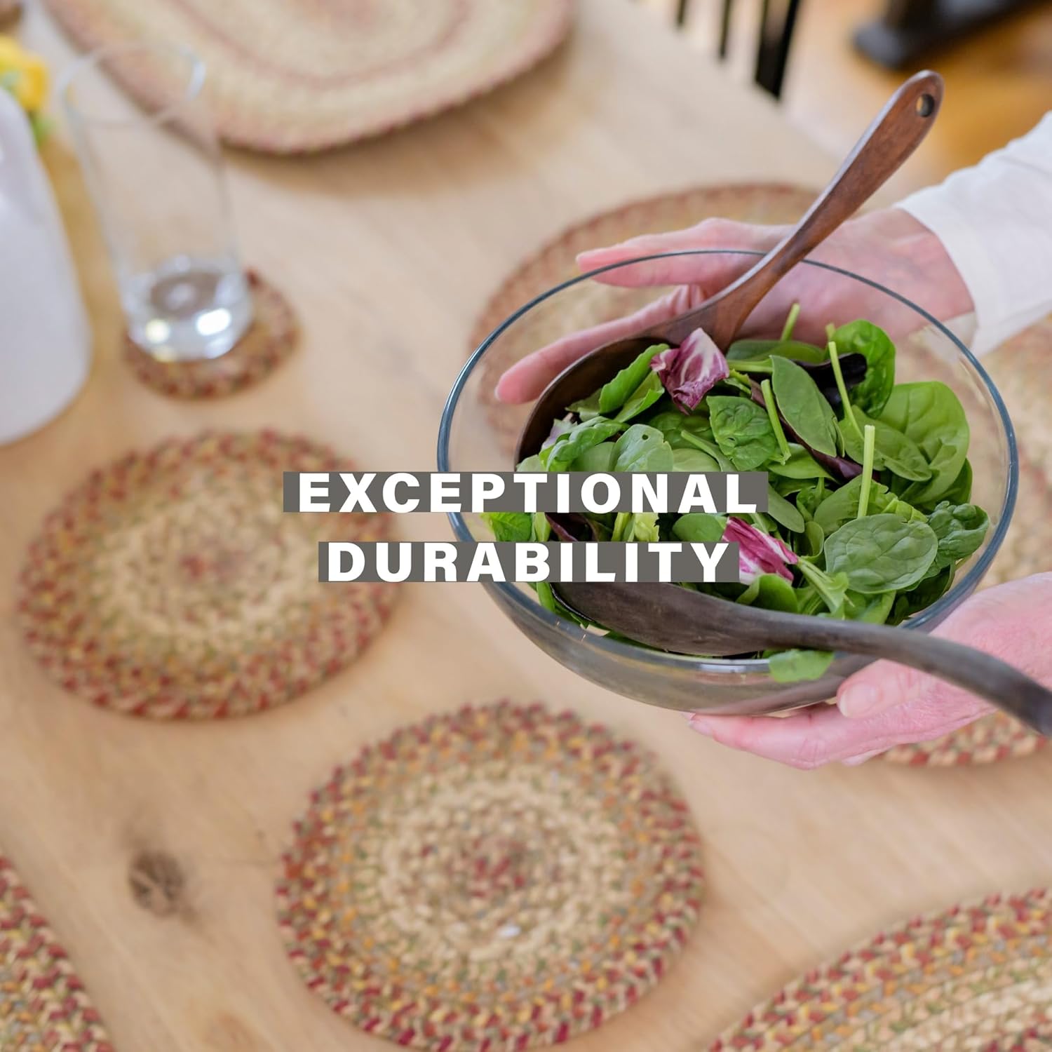 • DURABLE ROUND BRAIDED PLACEMATS: Our round braided placemats boast a unique design free from the typical tail found in oval braids, offering a sleek and refined look. The robust poly-cotton thread stitching ensures they withstand daily use, making them a long-lasting addition to your table setting.