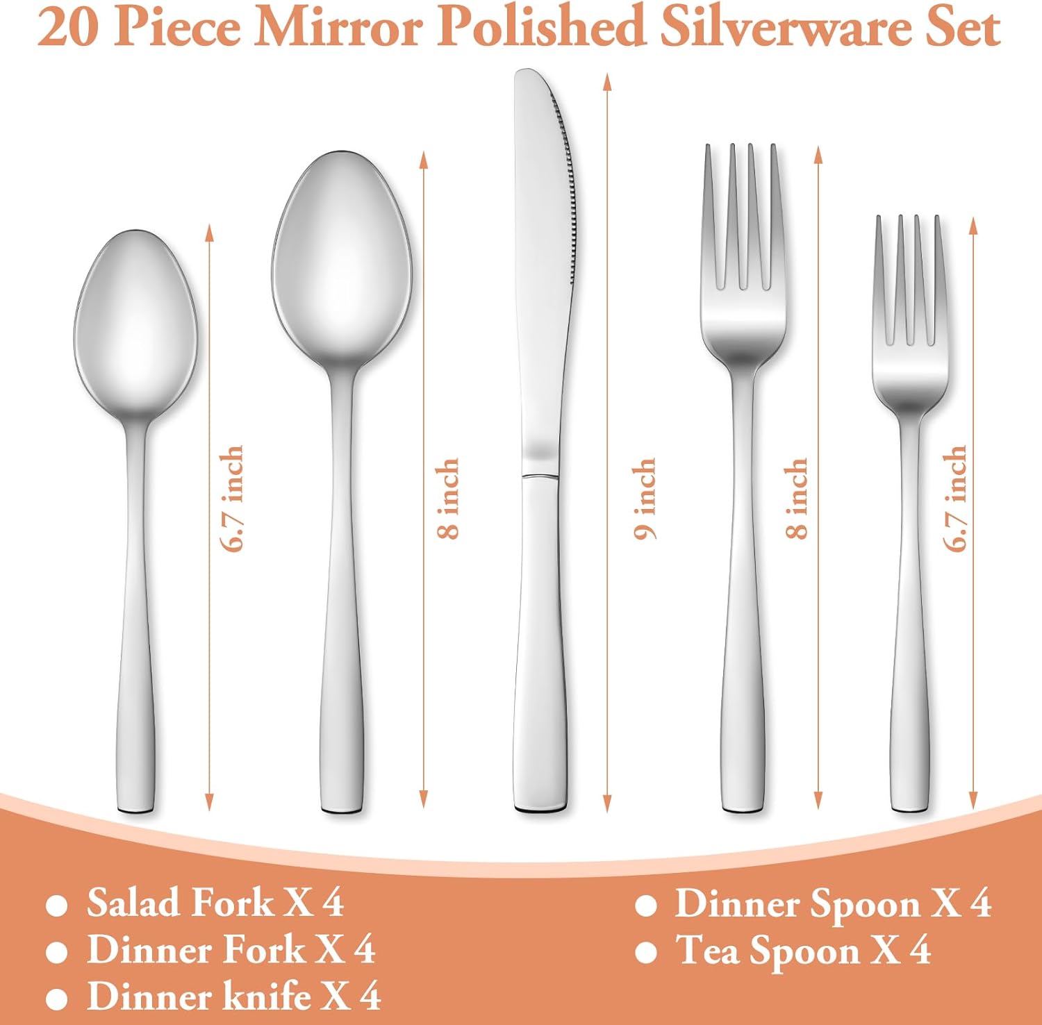 20 Pcs Silverware Set, Stainless Steel Flatware Set for 4, Food-Grade Cutlery Set, Mirror Polished Tableware Eating Utensils Set for Home Kitchen, Include Knife Fork Spoon Set, Dishwasher Safe
