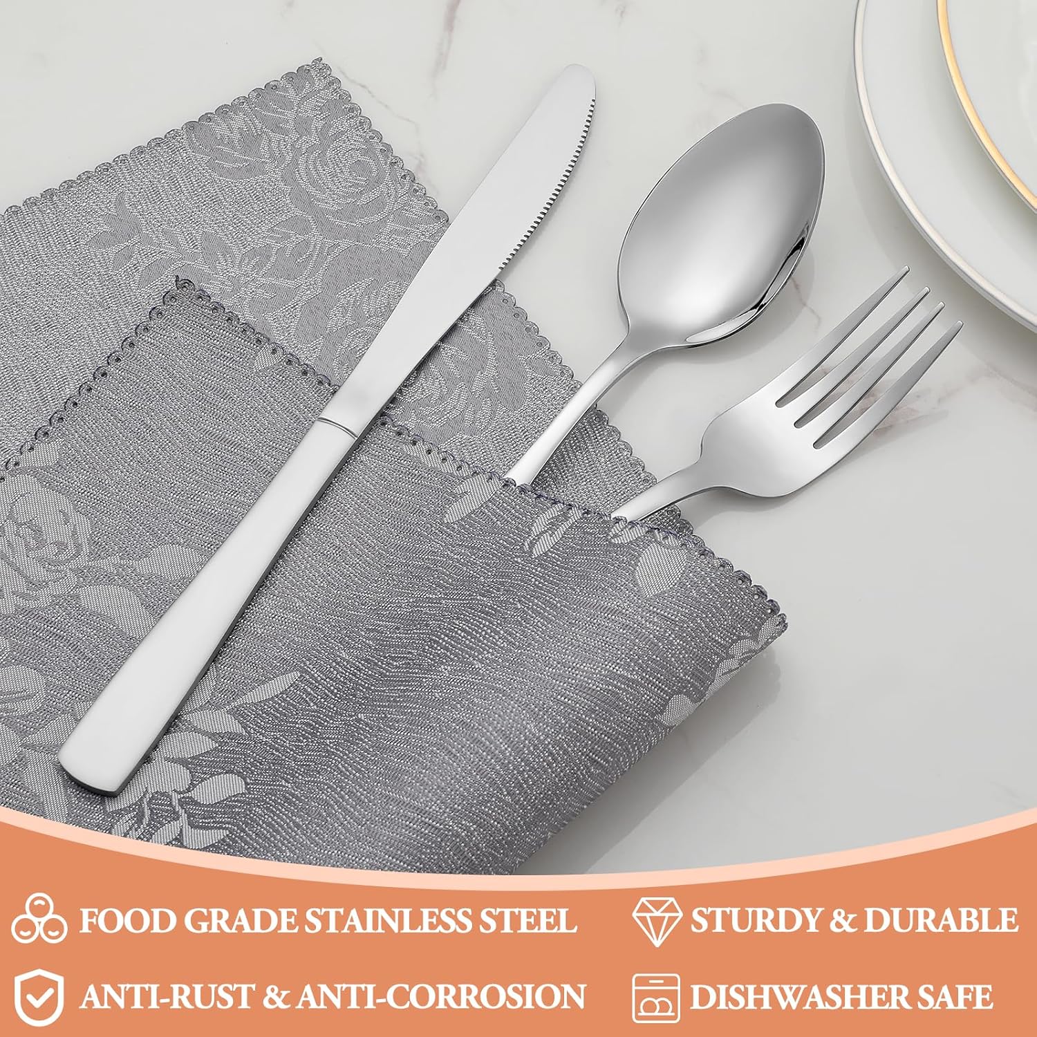 • HIGH QUALITY AND DURABLE: This silverware set is made of FOOD GRADE stainless steel which is very durable, corrosion resistant, rust-proof, non-toxic, BPA free, no metal aftertaste. Meanwhile, its sturdiness ensures that it will not bend easily providing you with long - term use.