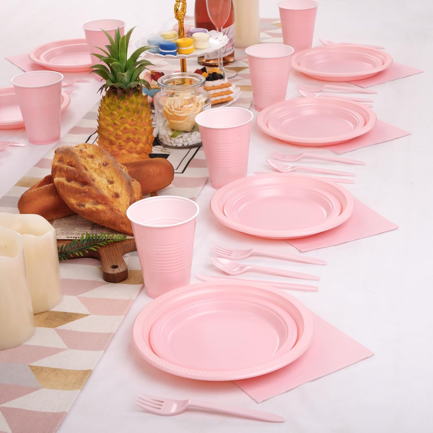 MirthMood 350pcs Pink Party Supplies Set, Disposable Plates Including Pink Plastic Plates, 12OZ Cups, Plastic Cutlery and Paper Napkins Serve 50 Guests for Wedding & Birthday & Party