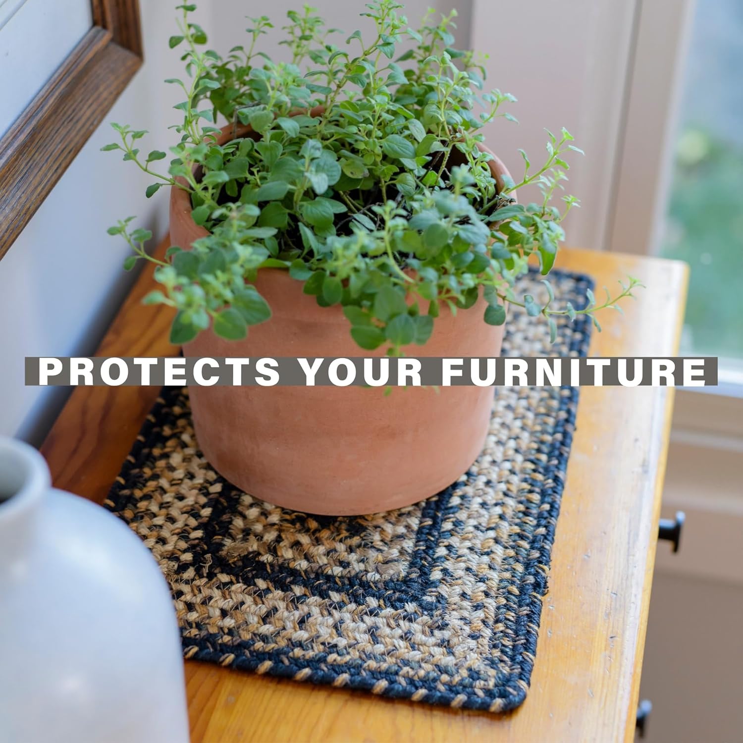 • KILIMANJARO JUTE BRAIDED RECTANGULAR PLACEMAT: A stunning combination of black, rich browns, coffee, soft cream and toasty tan, this rug stands the test of time. Protect your furniture and add a tasteful accent to your dinner table, bedside table, or living room furniture. This rectangular 10" x 15" jute placemat is ideal even for larger plates. Also available in oval shape.