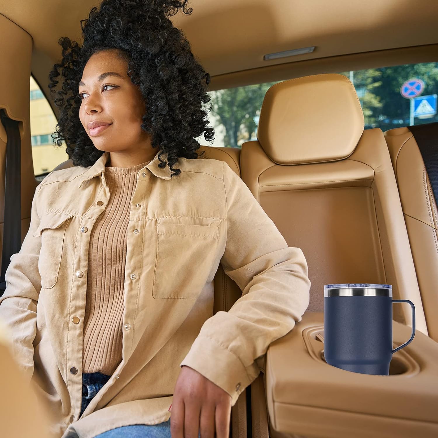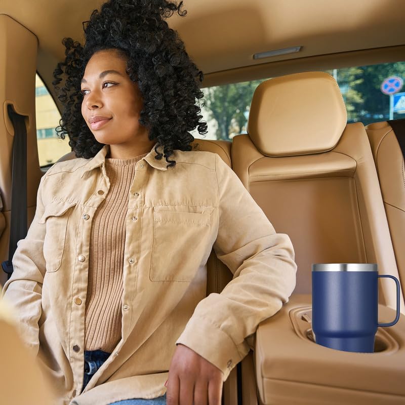 • Cupholder Friendly: The travel coffee tumbler 20oz is designed with a tapered shape which fits most car cup holders, equipped with a sturdy handle that allows easy carrying. Diameter 3.38" large cup mouth makes it easier for you to clean the stainless steel mug.
