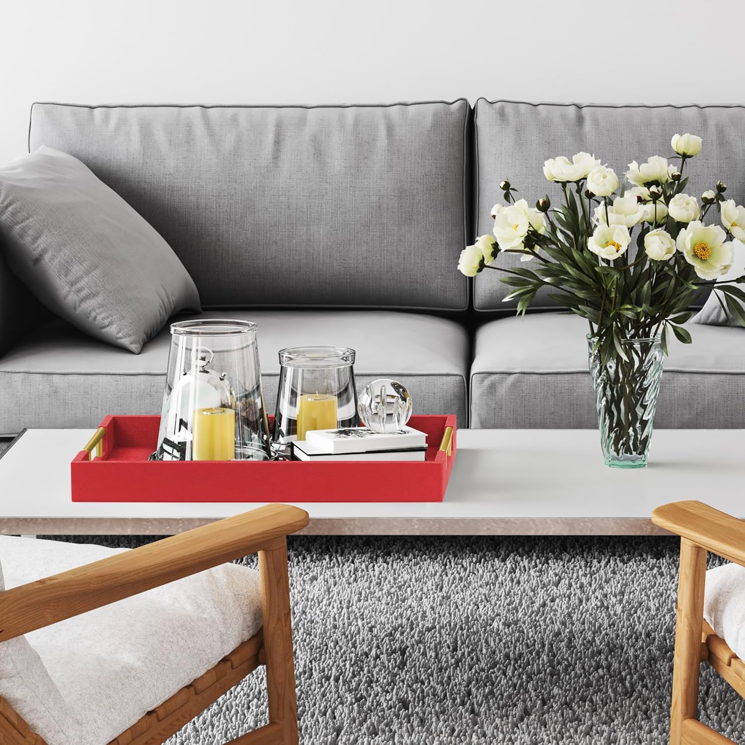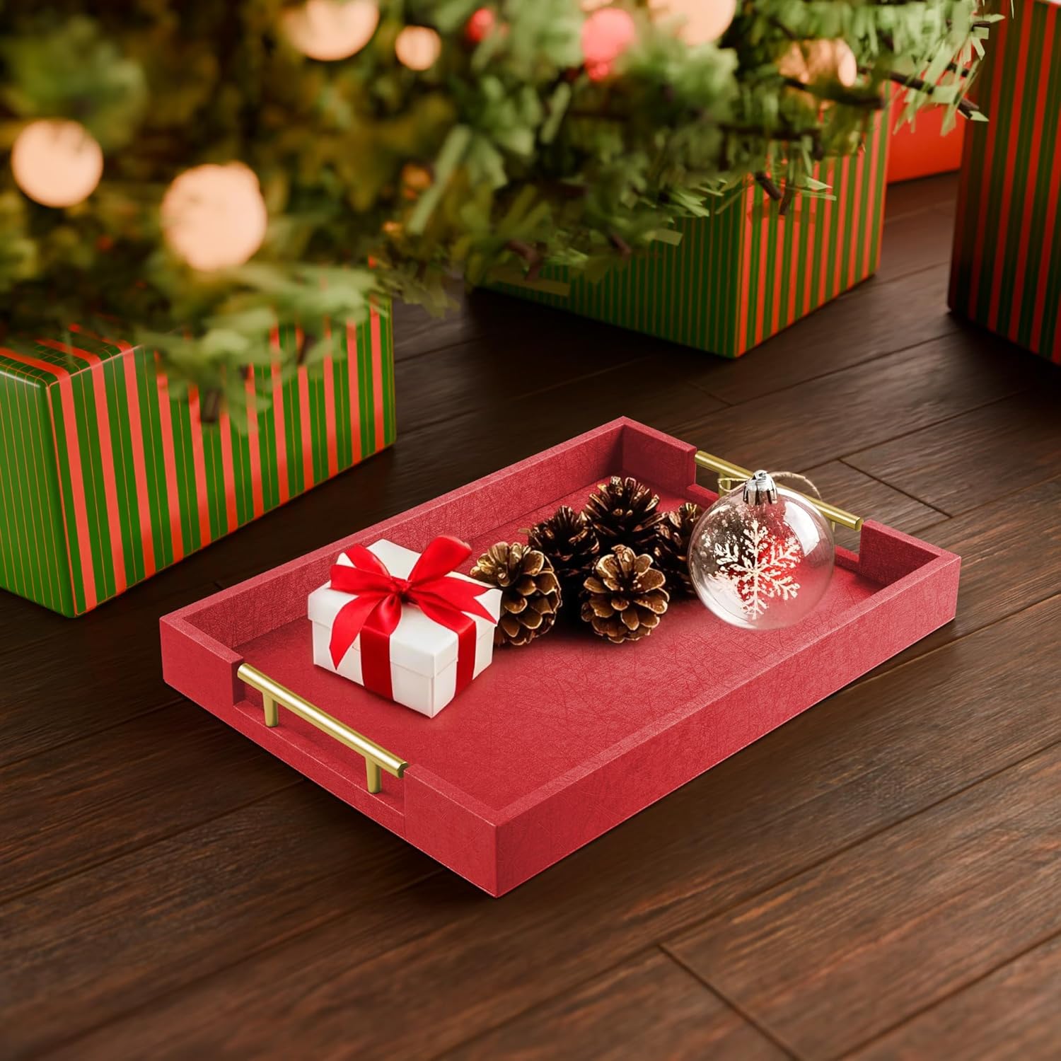 17" x 12" Wood Serving Tray with Gold Polished Metal Handles, Home Decorative Wooden Rectangle Ottoman Leather Decor Platter Bathroom Vanity Tray for All Occasions Red