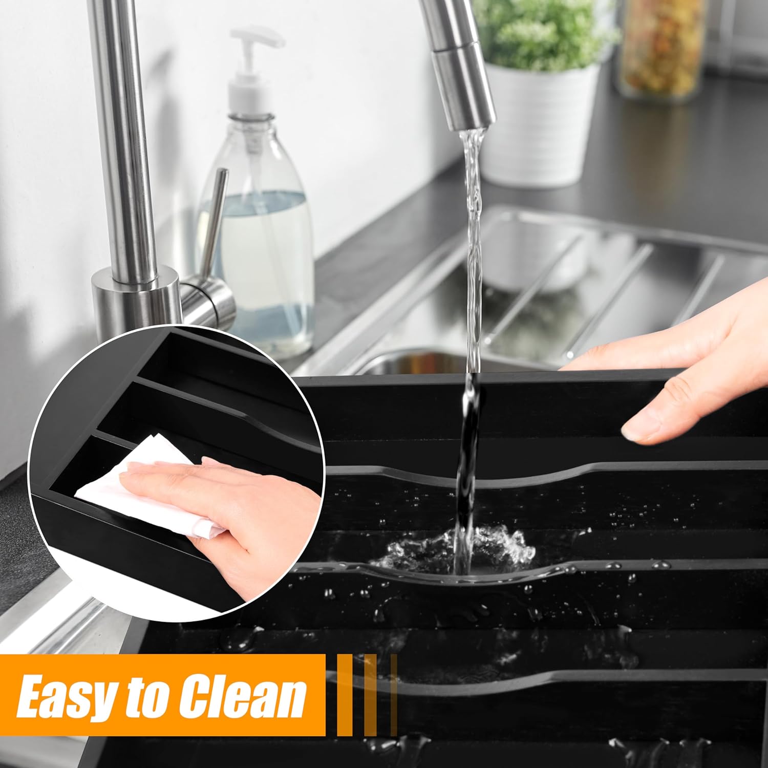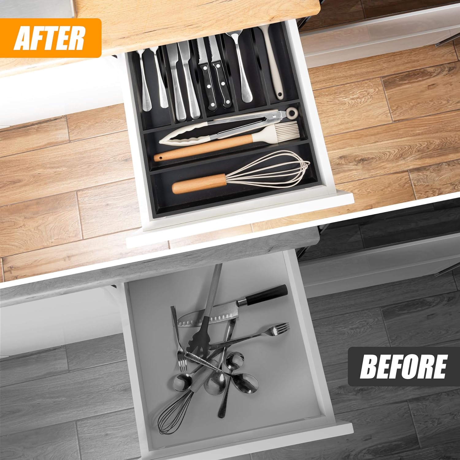 • ✅【Deep Compartments & Reinforced Base】Our utensil drawer organizer features compartments with a depth of 1.9 inches, helping maximize drawer space and perfect for storing more essential tools and gadgets. The utensil silverware drawer organizer flatware cutlery tray comes with a reinforced base, ensuring durability for long-term use, and is ideal for supporting the weight of heavy-duty utensils and knives. Keep everything you need conveniently at hand while cooking, neatly visible, and easy to grasp when preparing the next meal in the kitchen.
