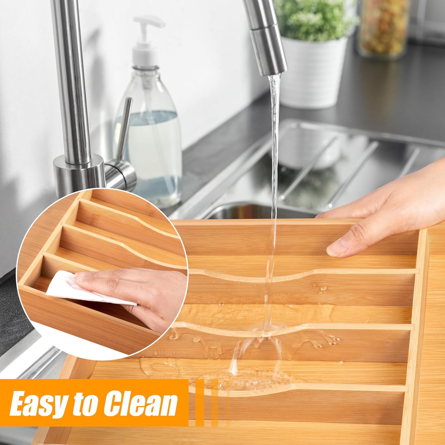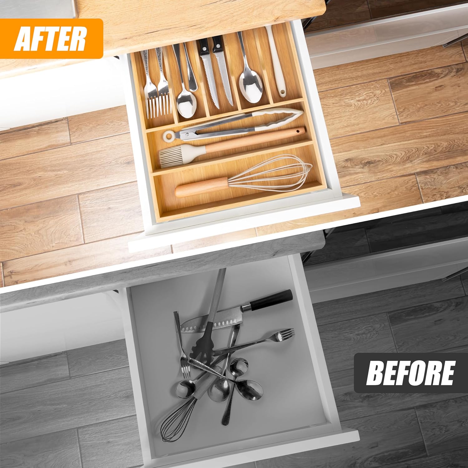 • ✅【Perfect premium bamboo】Our utensil silverware drawer organizer flatware cutlery tray is crafted from natural bamboo that has been grown for over 4 years. Each silverware drawer organizer made of bamboo is meticulously handcrafted by seasoned artisans to ensure a smooth, splinter-free surface. You can confidently allow your family or children to use our silverware drawer organizer. Unlike plastic and metal drawer organizers, our utensil holder is water-resistant and odor-resistant, making it perfect for long-term use.