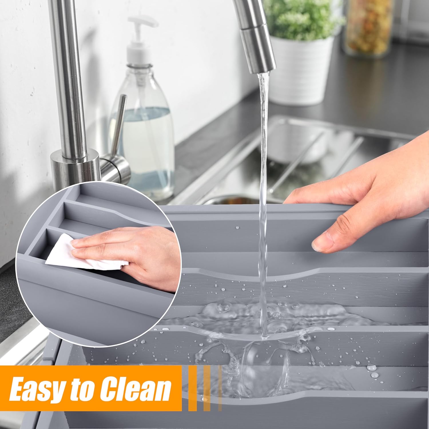 • ✅【Quality - Deep Compartments & Reinforced Base】Our utensil drawer organizer features compartments with a depth of 1.9 inches, helping maximize drawer space and perfect for storing more essential tools and gadgets. The utensil silverware drawer organizer comes with a reinforced base, ensuring durability for long-term use, and is ideal for supporting the weight of heavy-duty utensils and knives. Keep everything you need conveniently at hand while cooking, neatly visible, and easy to grasp when preparing the next meal in the kitchen.