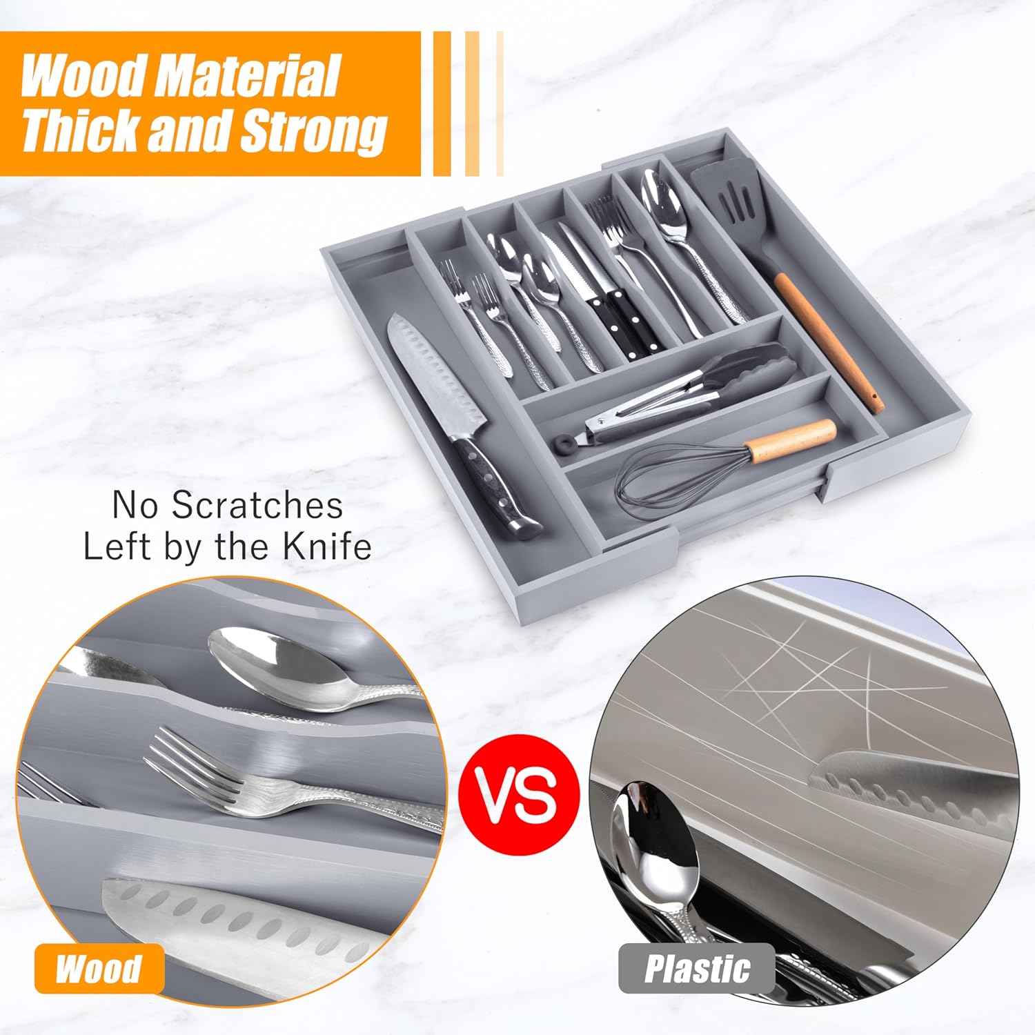 • ✅【Expandable - fit most kitchen drawers.】Our large utensil silverware drawer organizer flatware cutlery tray are adjustable in width, expanding from 17"x13" to 17"x19.6" as needed, with a depth of 1.9" . The utensil silverware drawer organizer is crafted from natural bamboo that has been grown for over 4 years. Each silverware drawer organizer made of bamboo is meticulously handcrafted by seasoned artisans to ensure a smooth, smooth surface. You can confidently allow your family or children to use our silverware drawer organizer.