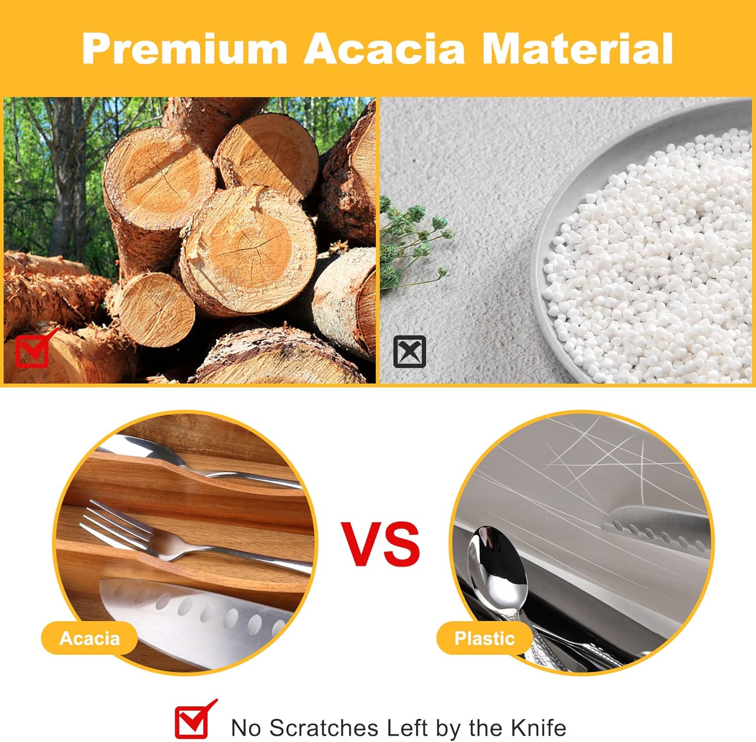 • ✅【Sturdy and Well-made】Our silverware tray for drawer is made of minimally refined natural acacia, a renewable, sustainable source, making them a green choice, with the age of over 4 years, which makes the silverware holder durable enough for long time use. Unlike the plastic and metal drawer organizer, our flatware & utensil is water & odor resistant, the silverware organizing tray is perfect for years of use, especially in kitchens where things can get messy quickly.
