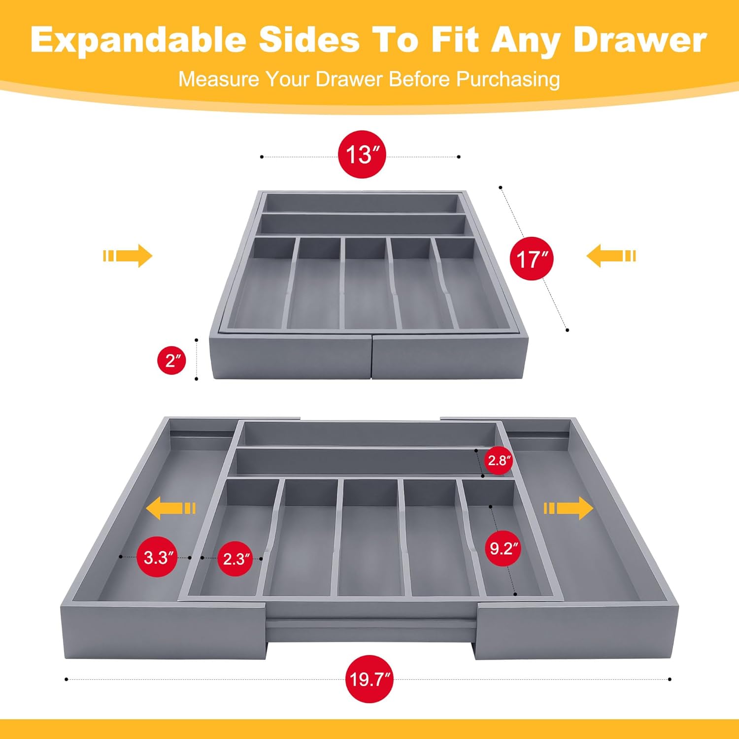 Large Premium Bamboo Silverware Organizer - Expandable Drawer Organizer & Utensil Organizer - 17"x19.7" Cutlery Tray with Dividers for Kitchen Utensils and Flatware (7-9 Slots) (Grey)