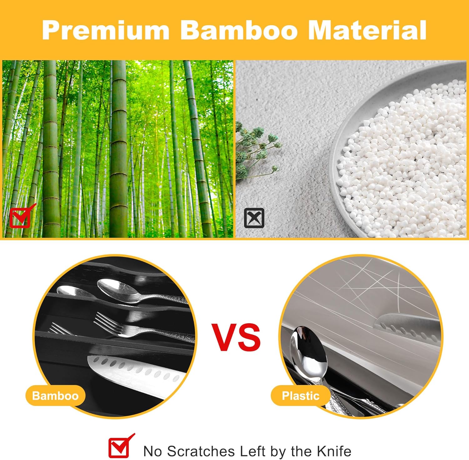 • ✅【Sturdy and Well-made】Our silverware tray for drawer is made of minimally refined natural bamboo, a renewable, sustainable source, making them a green choice, with the age of over 4 years, which makes the silverware holder durable enough for long time use. Unlike the plastic and metal drawer organizer, our flatware & utensil is water & odor resistant, the silverware organizing tray is perfect for years of use, especially in kitchens where things can get messy quickly.