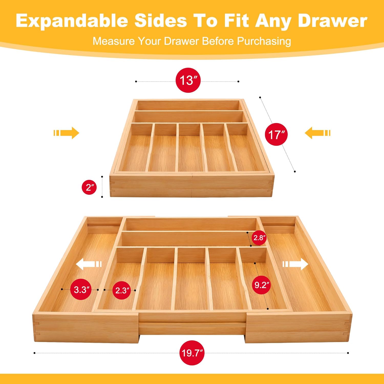 • ✅【Expandable to Fit Most Standard Kitchen Drawers】Our deep bamboo drawer organizer is ideal for saving kitchen storage space, thanks to its adjustable storage drawers that expand from 17”x13” to 17x19.7” wide with 1.9” deep slots. This drawer simply pulls away from both sides to expand from 7 to 9 compartments for extra storage space and to make the wider drawer more stable. Different sized compartments are available to store standard silverware and large cutlery.