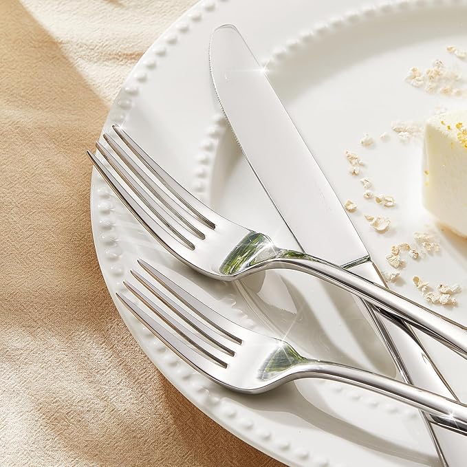 • Heavy Duty Flatware : Featured with thick-gauge construction, thick construction will not bend and damage after long term used. Thick but not bulky, well balanced and feel great in the hand, ergonomic design, comfortable to hold.
