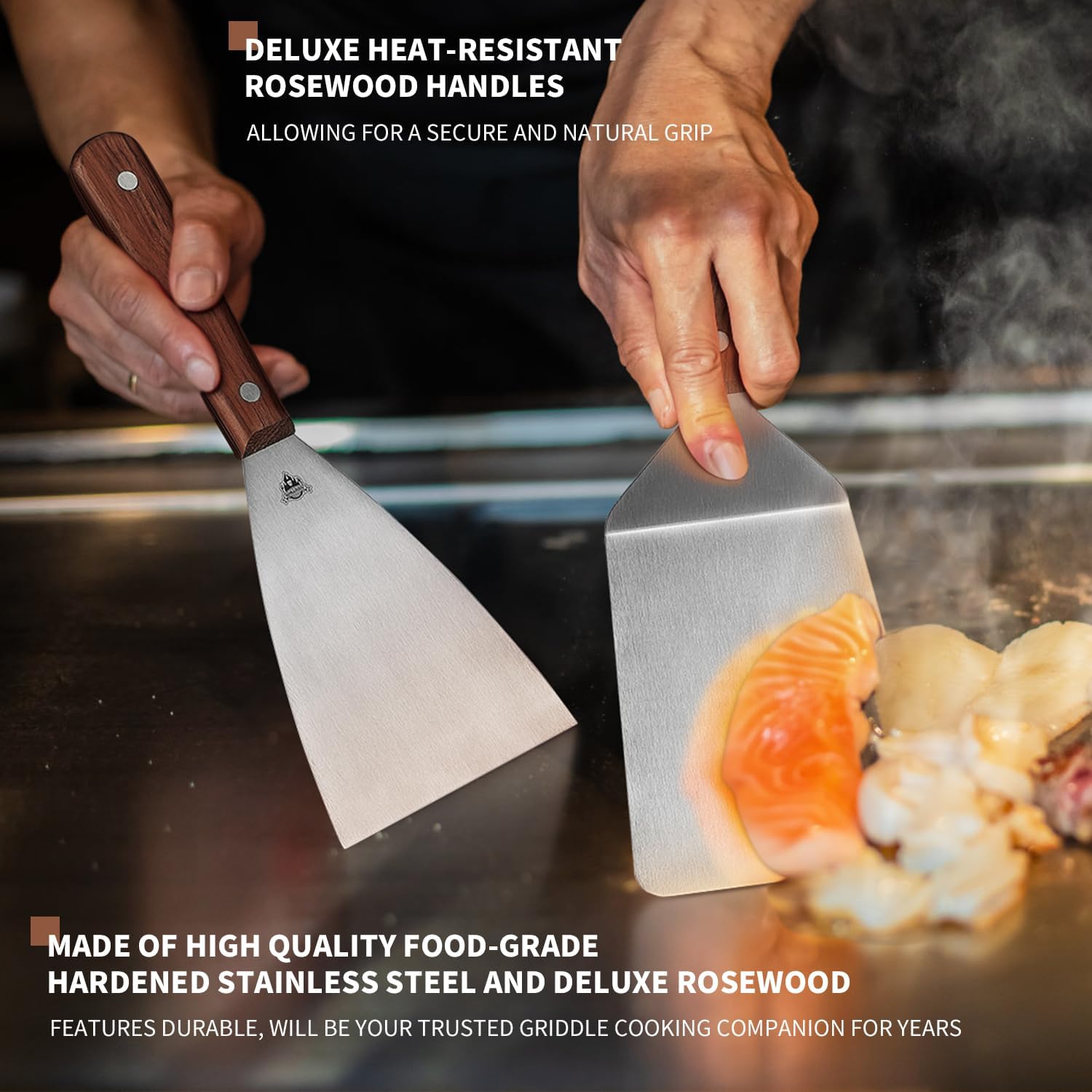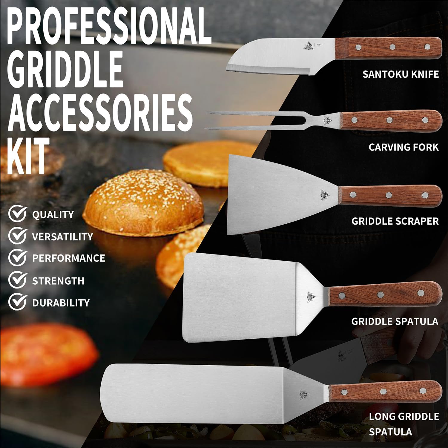 GRILLGEN 6-Piece Professional Griddle Accessories Kit for Griddle Cooking, Premium Rosewood Handles Spatulas Set with Scraper, Santoku Knife, Carving Fork, Storage Bag, Flat Top Grill Accessories