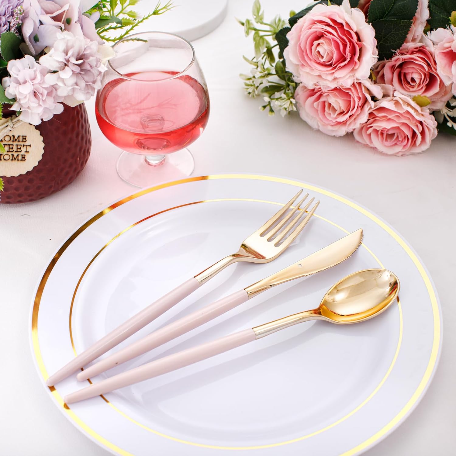 I00000 60 Pack Pink Plastic Silverware,Gold Disposable Flatware with Pink Handle, Gold Plastic Cutlery Set Includes: 20 Forks, 20 Knives and 20 Spoons, Tableware Set for Party and Wedding