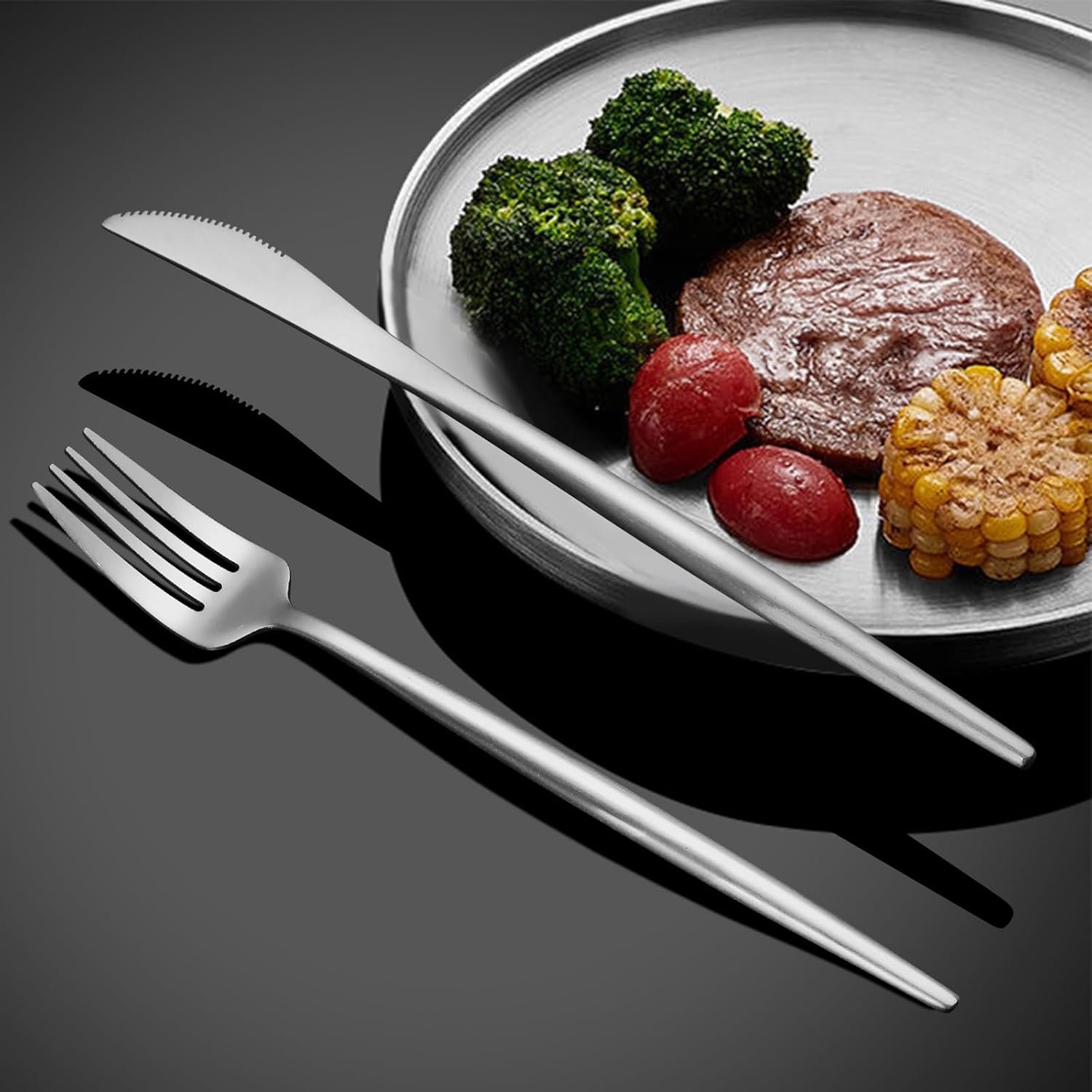 • 【40-PIECE MATTE SILVERWARE SET】🍴 In this fork and spoon silverware set, you'll have 8 dinner knives, 8 dinner spoons, 8 dinner forks, 8 dessert forks and 8 dessert spoons. Our luxury silverware set offers an enjoyable meal and a fine dining experience, it is essential for formal occasions, perfect for daily use, it can effortlessly blend any theme & decorations.