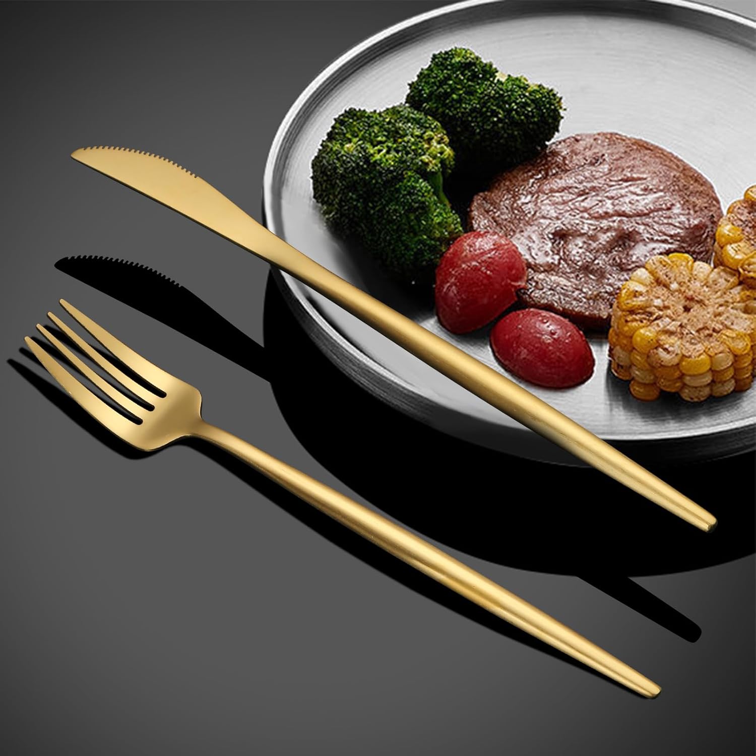 • 【ORNATE AND SLEEK DESIGN】🍴 TUPMFG matte gold silverware has a classic round head and silhouette with clean lines handle design, it’s extremely gorgeous in appearance, highly texture tones & eye-catching looking makes this set standing out from the ordinary silverware. These kitchen cutlery set is perfect for hosting dinners and gatherings, also as a practicality and sophistication gift.