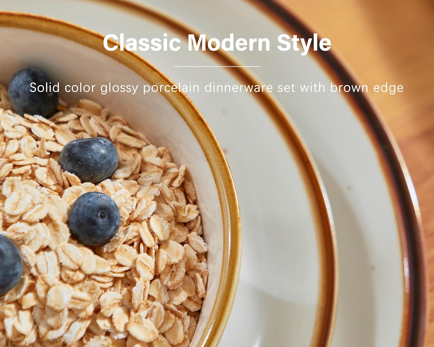 • Farmhouse Style: Cream white porcelain dishes set, the brown edges of the plates and bowls are hand-painted, with maroon speckles scattered across each plate (no speckles on the bowls).Simple modern style and exquisite design bring artistic flair to these plates and bowls sets, which can be integrated into most kitchen environments and add highlights to your dining table