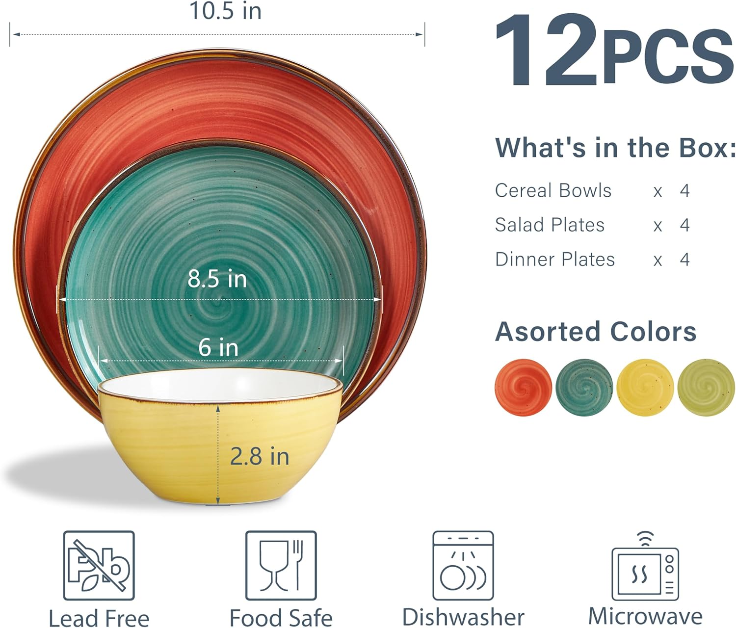 • What's In the Box: This 12-piece ceramic dinnerware set includes the plates and bowls you need for a complete dining experience: 10.5 inch dinner plates *4, 8.5 inch salad plates *4, and 24 oz cereal/soup bowls *4