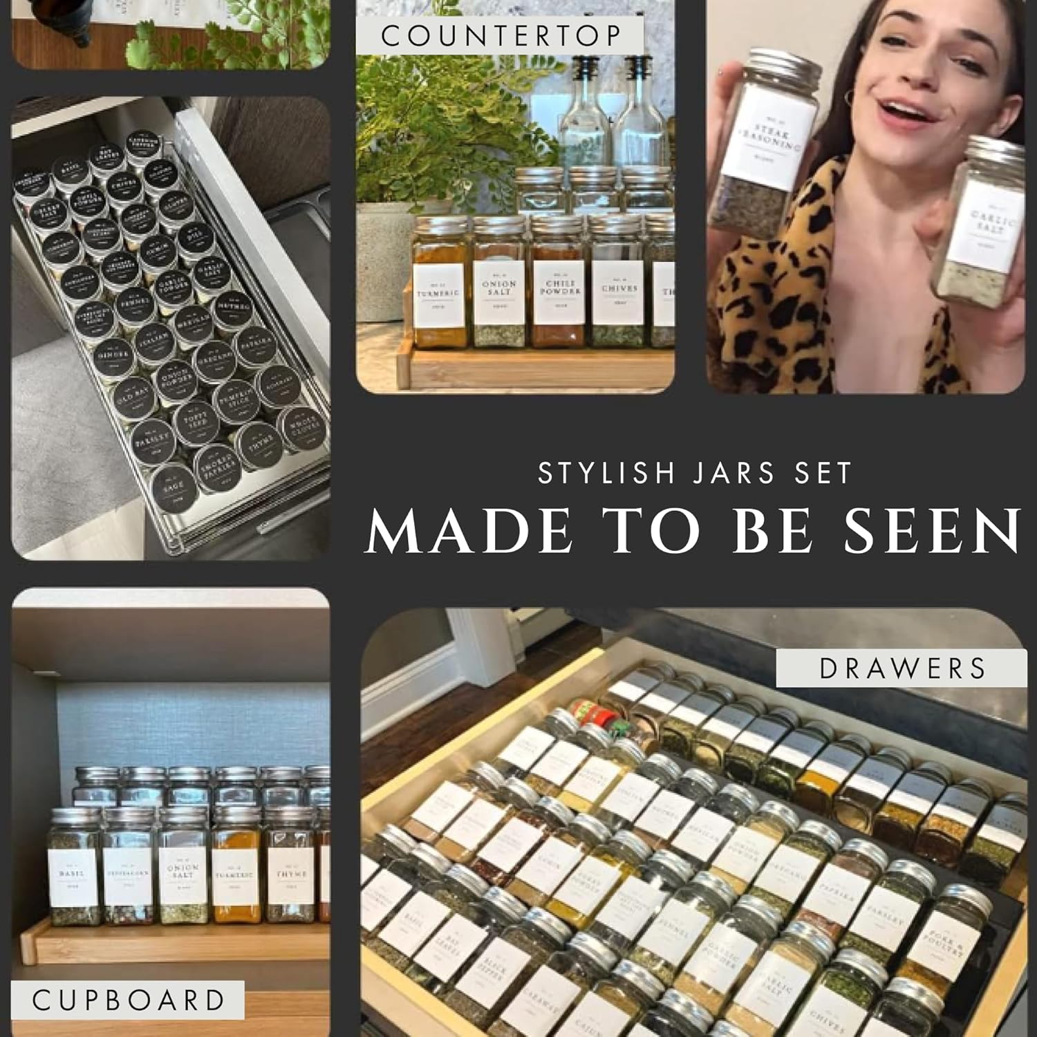 • STRONG PERFECTLY SIZED GLASS JARS: Crafted from thick, durable glass, each glass spice jar is perfectly sized for ample spice storage. This spice jar set is designed to fit seamlessly into any drawer, pantry, or cabinet, optimizing both space and convenience in your kitchen