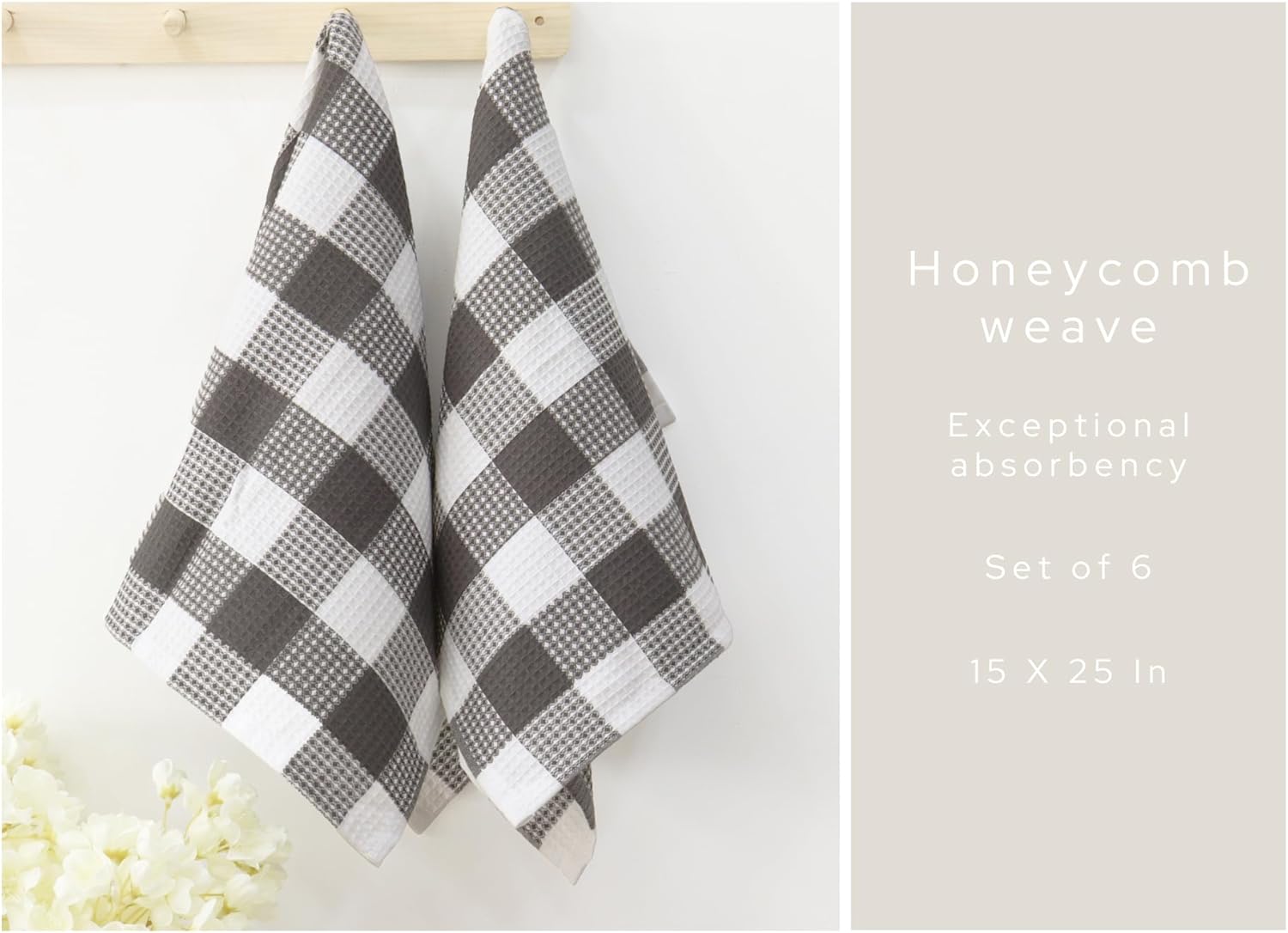 • Pack of 6 Waffle Weave Dish Towels measuring 15 by 25 Inches.