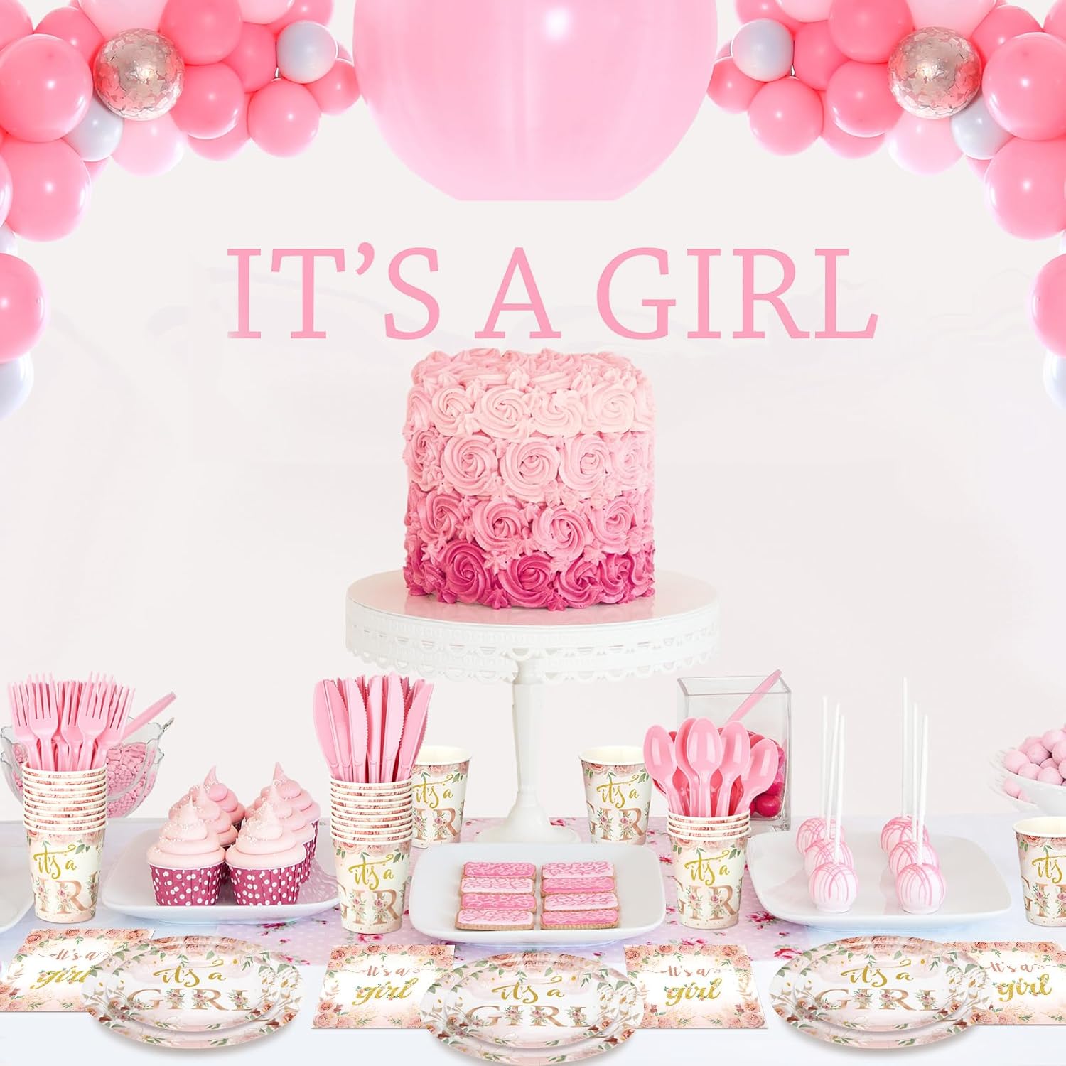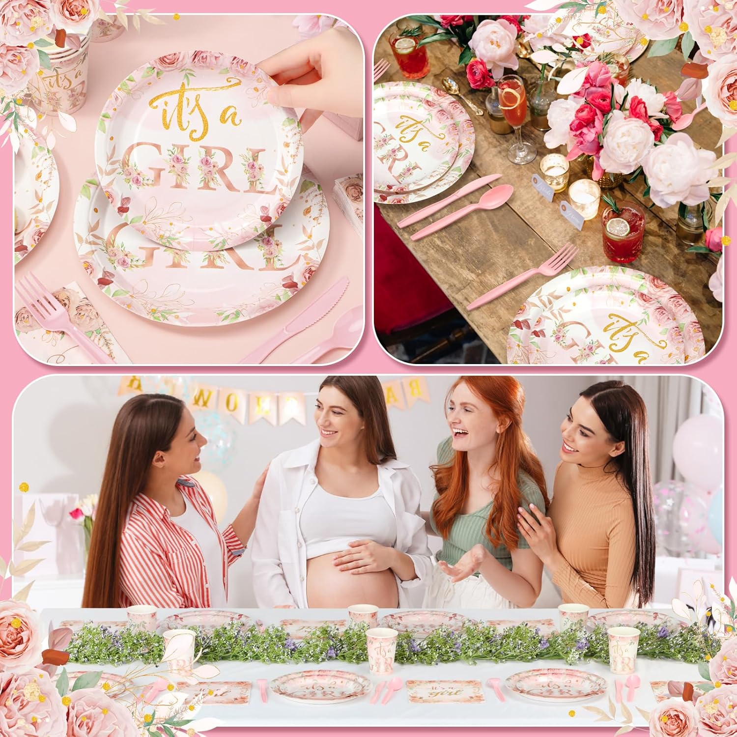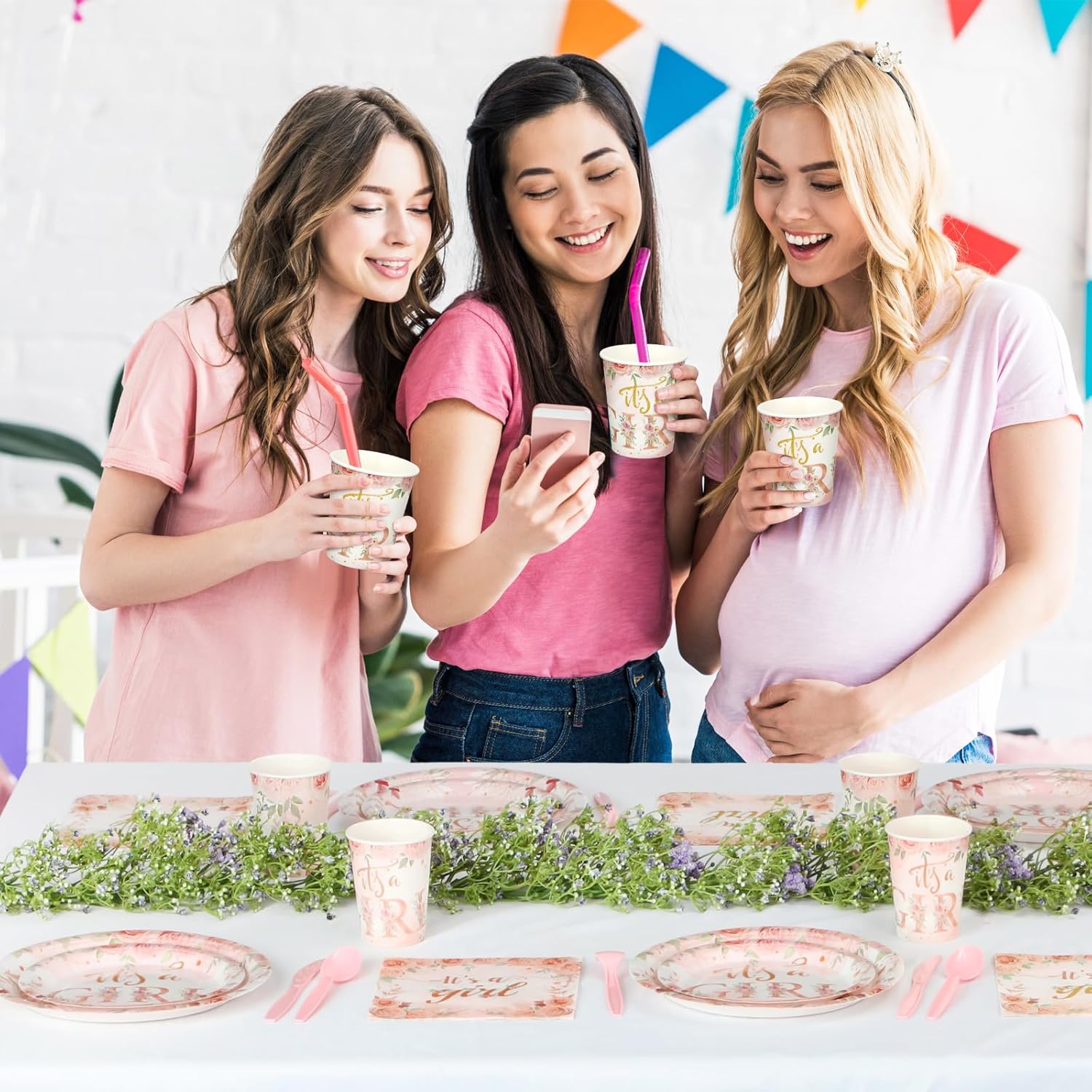 Dandat 350 Pcs Baby Shower Plates Set Baby Shower Party Supplies Serves 50 Tableware Sets Include Plates Napkin Cup Forks Knives Spoons Disposable Dinnerware(Floral,Pink)
