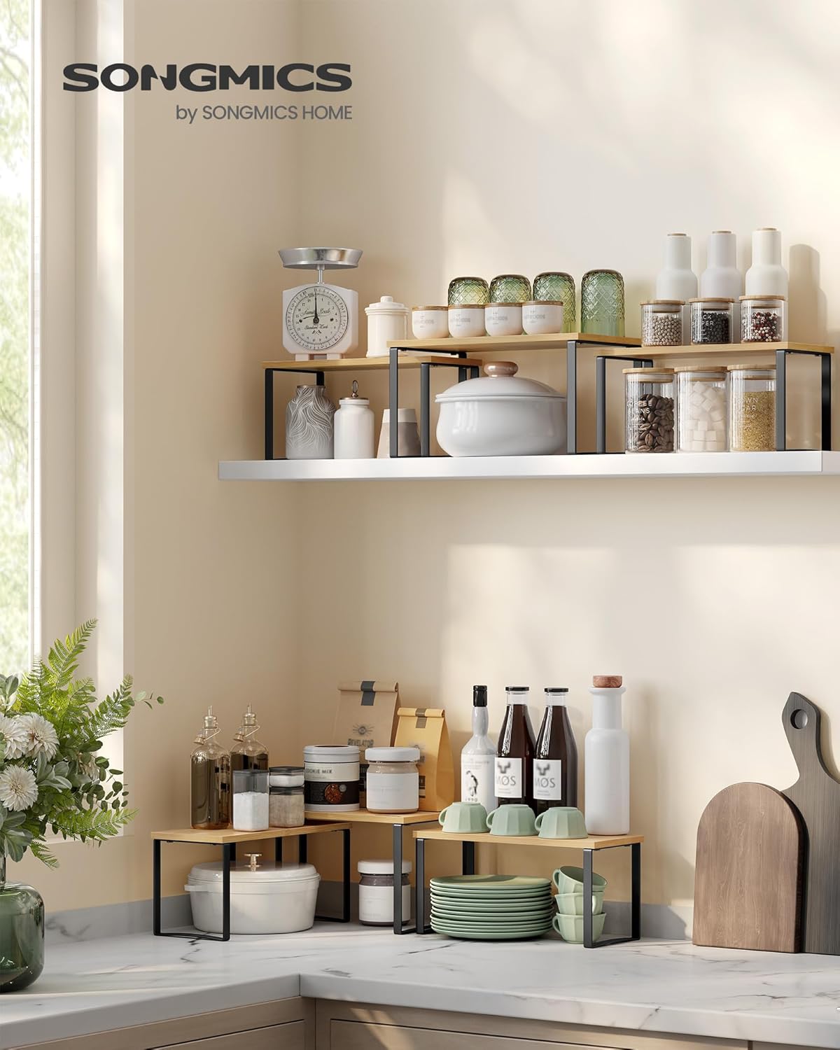 • 【STURDY AND DURABLE】Crafted from premium engineered wood and metal, these shelf organizers offer a robust construction. With a max. load capacity of 16.5 lb per spice rack, your kitchen essentials are securely stored