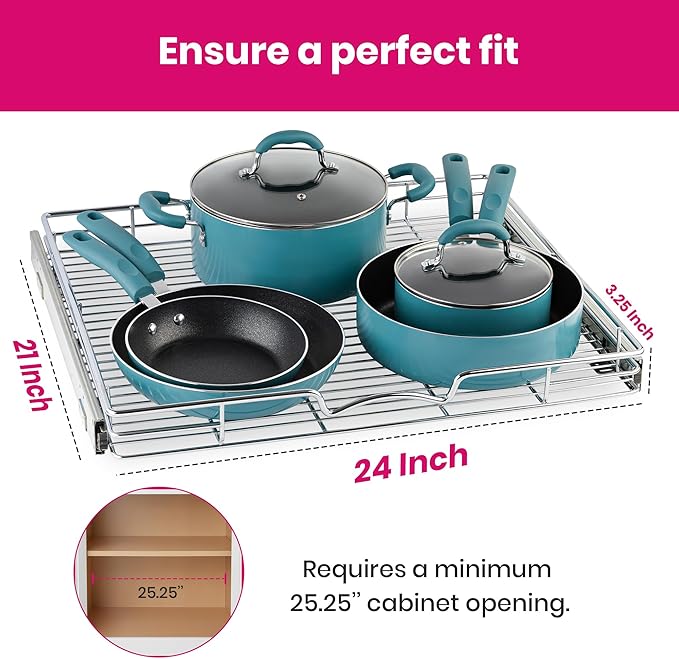 • EASY TO INSTALL & HARDWARE INCLUDED: Our pull out cabinet organizer dimensions measure 24”W x 21”D x 3.25” and include simple step-by-step instructions along with all of the hardware necessary for easy installation. Installs with just a few simple screws, and Fits cabinet openings 25-1/4”and larger