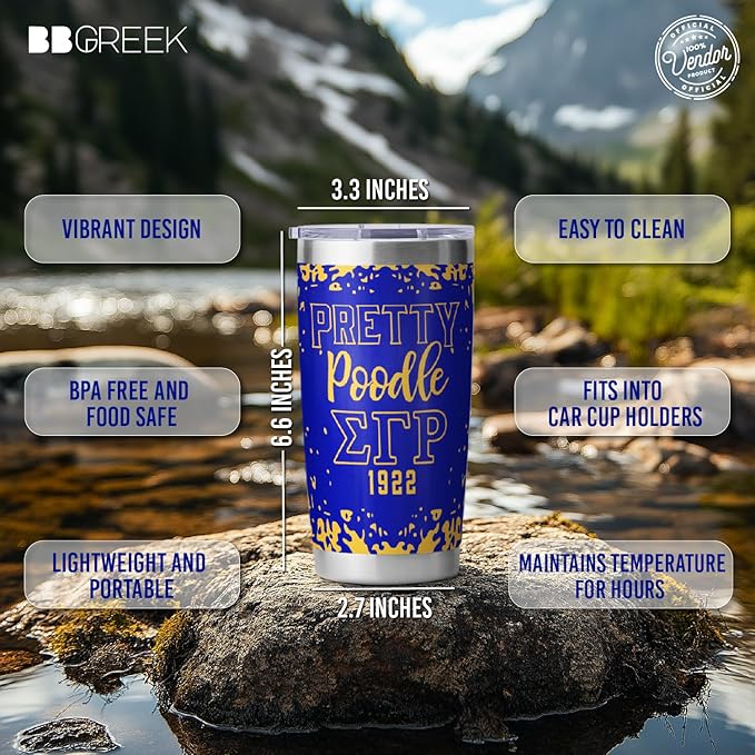 • SIGMA GAMMA RHO TUMBLER:This 20 oz stainless steel tumbler features the elegant "Poodle" design, reflecting the values of Sigma Gamma Rho Sorority. Its vibrant and stylish design adds charm and practicality to daily hydration routines.