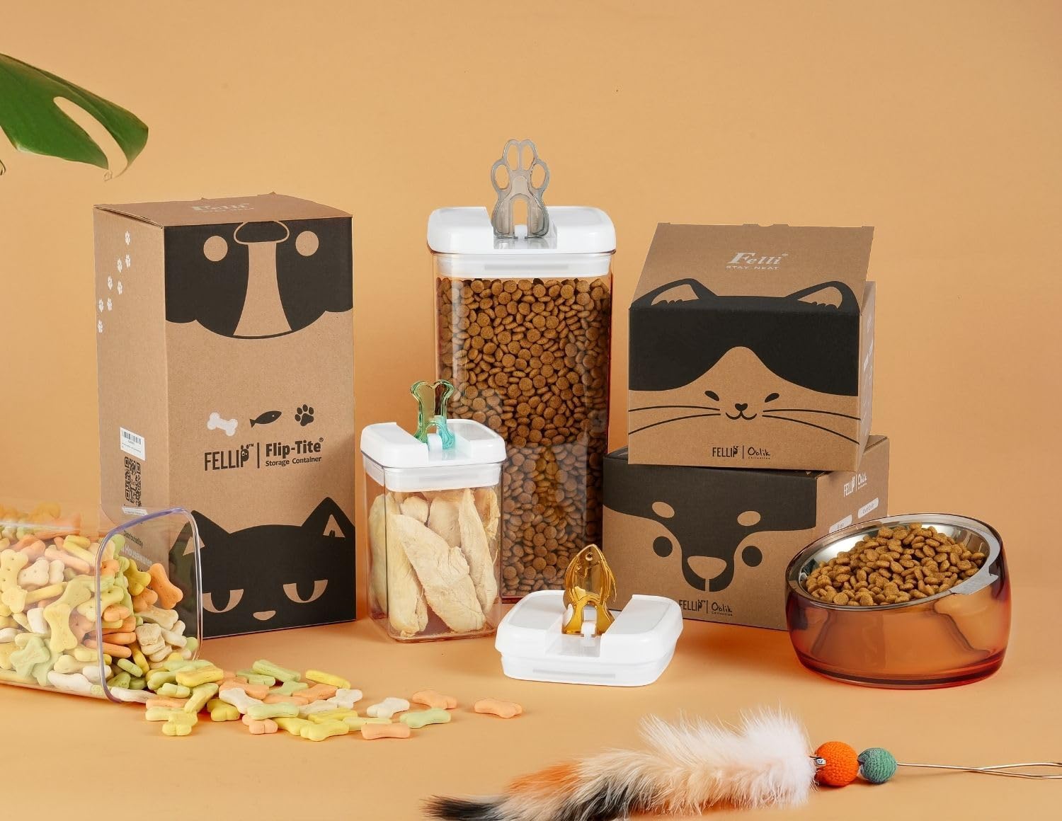 Felli Flip Tite Pet Food Container with Airtight Lids, BPA FREE Acrylic Canister with Paw Bone Fish Flip Top Handles for Cat Dog Kibble Treats Storage, Keep Fresh (Pet Collection Nest-L3pk)