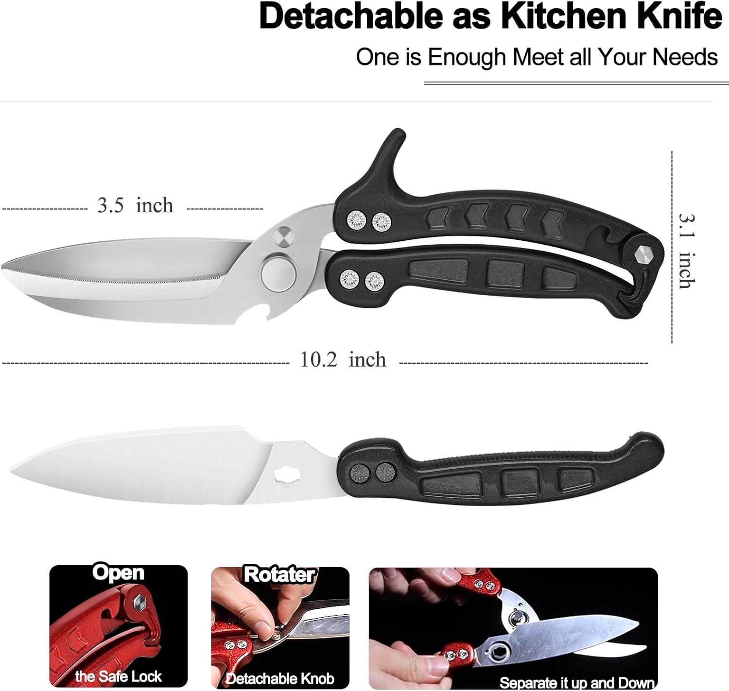 Heavy Duty Kitchen Shears, Detachable Poultry Shears with Serrated Edge, Spring-Loaded Stainless Steel Chef Scissors Cutting Bone, Chicken, Fish, Food, Meat, Black Full Steel Handle