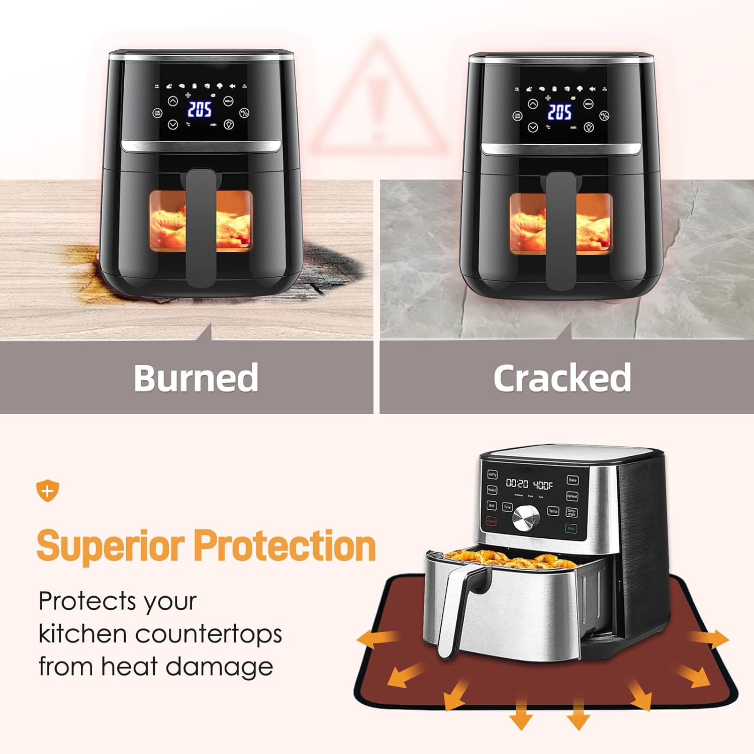 • 【Protect Your Countertop】The heat resistant mats for countertop can effectively protect your countertop from the damage of heat dissipation, to avoid the air fryer or hot pot break your wood or marble countertop.
