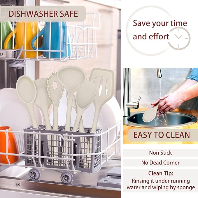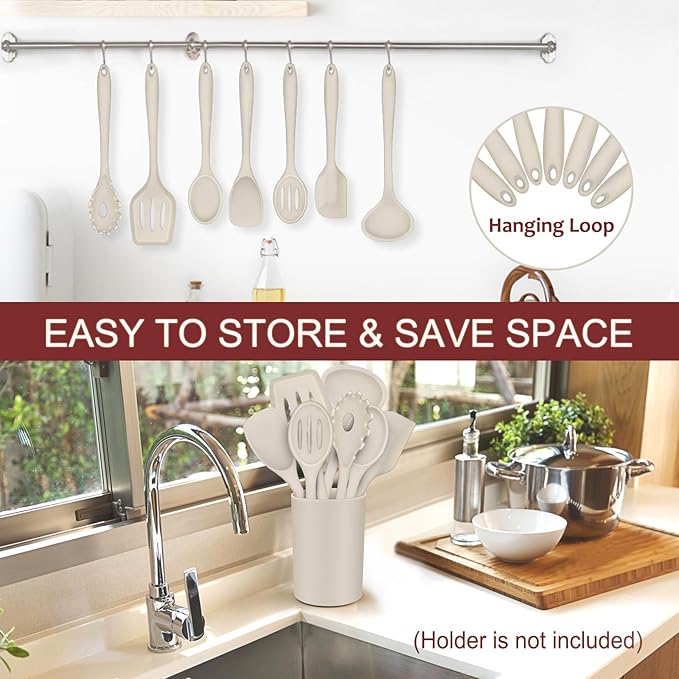 P&P CHEF Silicone Cooking Utensils Set of 7, Heat-proof Kitchen Utensils Set for Nonstick Cookware, Non-stick Spatula, Slotted Turner, Soup Ladle, Pasta Server, Spoon for Cooking Serving - Khaki